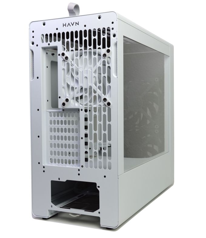 Unter dem Deckel zeigt sich eine anpassbare Lüfterblende. Mit der werkseitigen Konfiguration ist sie für 120- und 140-mm-Lüfter geeignet. Nach dem Lösen von drei Kreuzschlitzschrauben kann den rechten Teil der Lüfterblende weitgehen entfernen und damit Platz für zwei 180-mm-Deckellüfter schaffen. Es ist zudem möglich, auch die komplette Blende zu entfernen, so dass die Mainboardkammer sowohl von der Seite als auch von oben her zugänglich ist. HAVN beschreibt das als halboffenes Gehäusedesign. Alternativ ist unter dem Deckel genauso wie hinter der Front die Montage eines 360-mm-Radiators möglich. Als Frontradiator ist sogar ein 420-mm-Modell möglich.