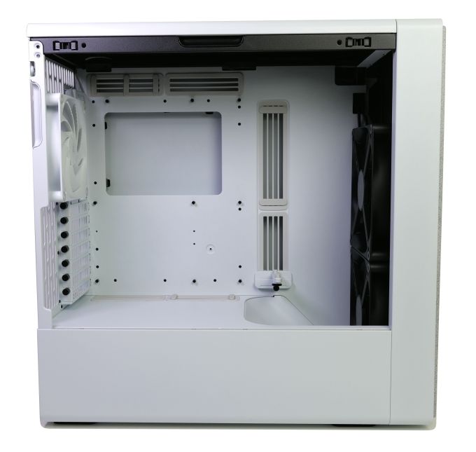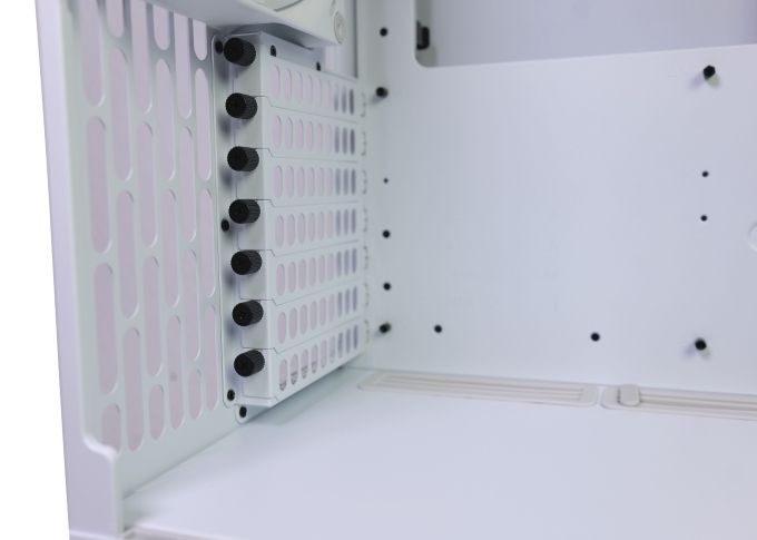 Während die Mainboardkammer von einem minimalistischen Design geprägt wird, sieht es hinter dem Mainboardträger sehr technisch-funktional aus. Hier sitzen die Laufwerkshalterungen, ein PWM-Hub und auch einige spezielle Kabelführungen.