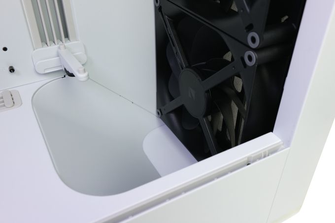 Der untere 180-mm-Lüfter sitzt praktisch nur minimal über dem Gehäuseboden. Damit sein Luftstrom die Mainboardkammer erreicht, nutzt HAVN einen aerodynamischen Einsatz. Er lenkt den Luftstrom so, dass er schräg von unten auf die Grafikkarte trifft und deren Kühlung unterstützt. HAVN hat mit verschiedenen Winkeln experimentiert und ist letztlich zu dem Schluss gekommen, dass ein Winkel von 135° für diesen aerodynamischen Einsatz optimal ist. Darüber ist eine kompakte und verstellbare Grafikkartenstütze zu sehen.