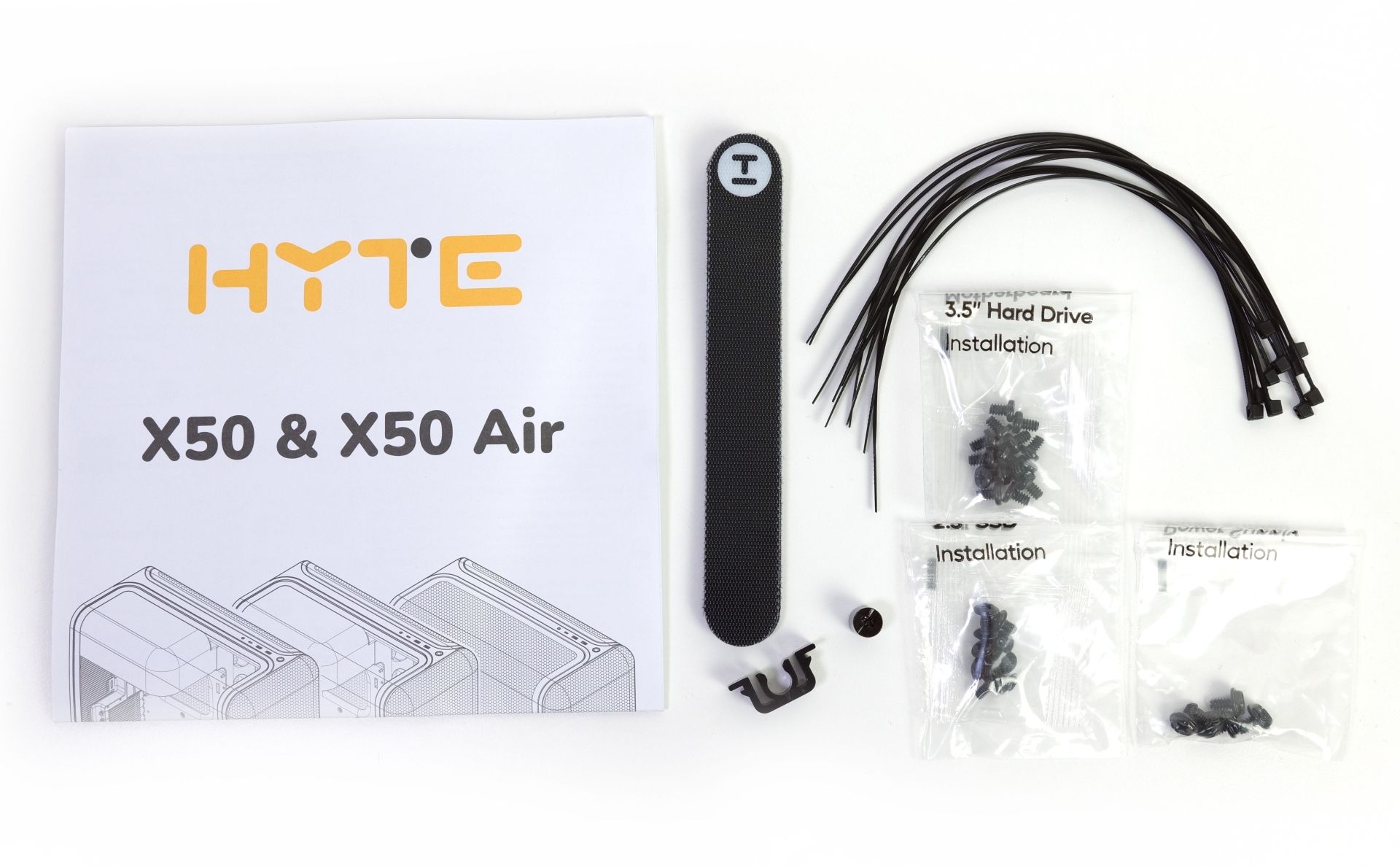 Hyte liefert das X50 mit Anleitung, dem Montagematerial, schwarzen Kabelbindern und Klettverschlüssen aus.