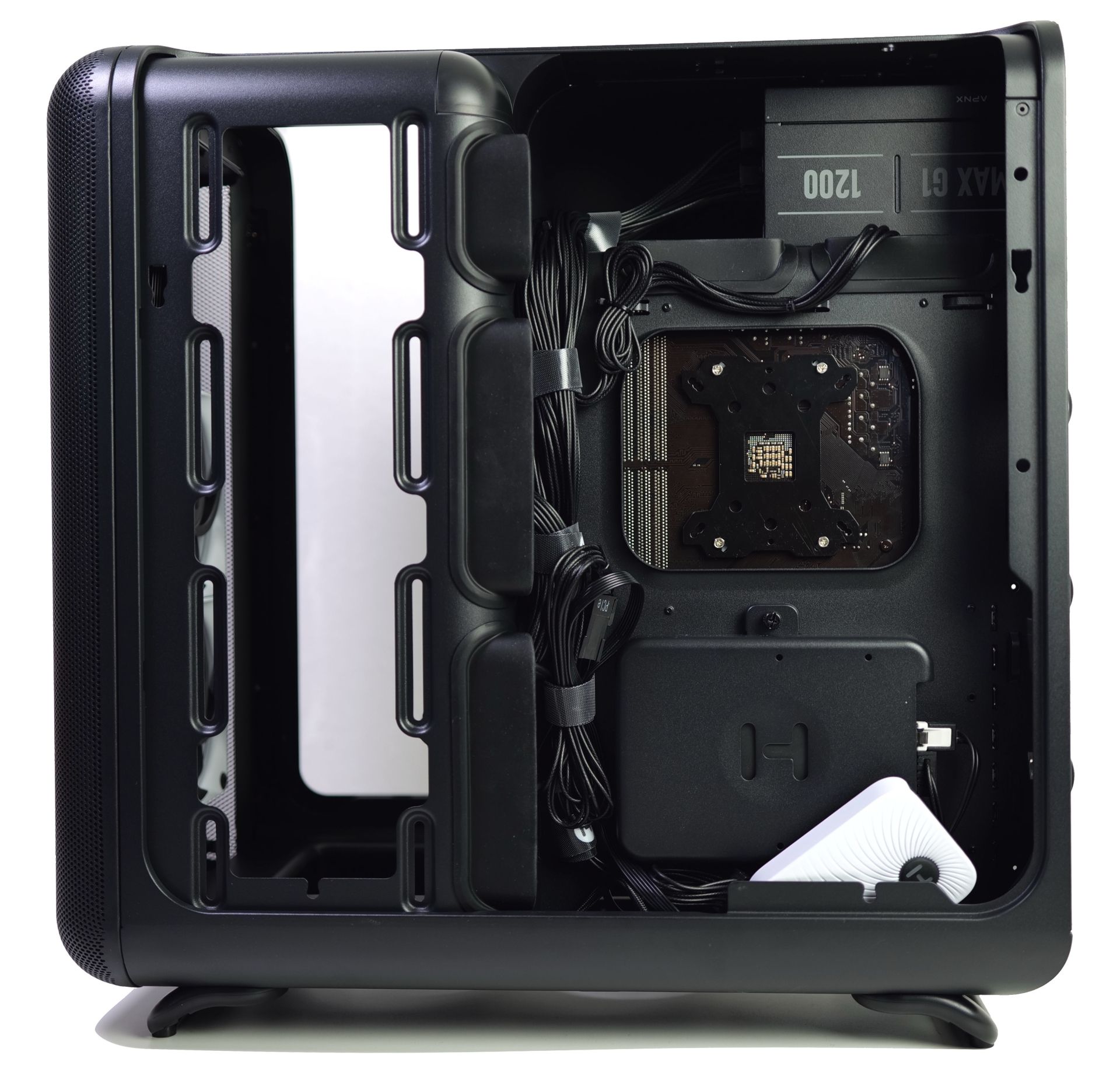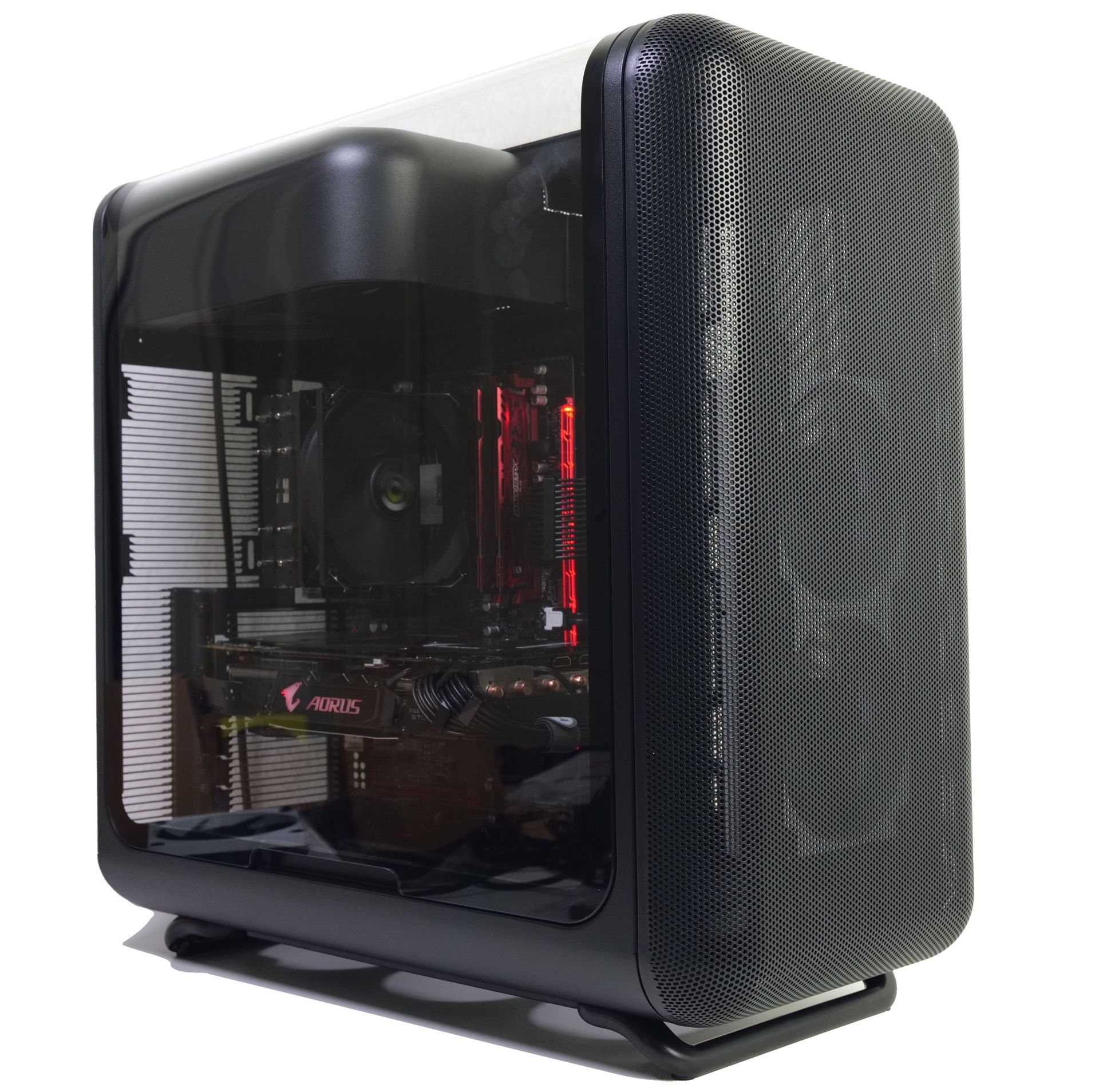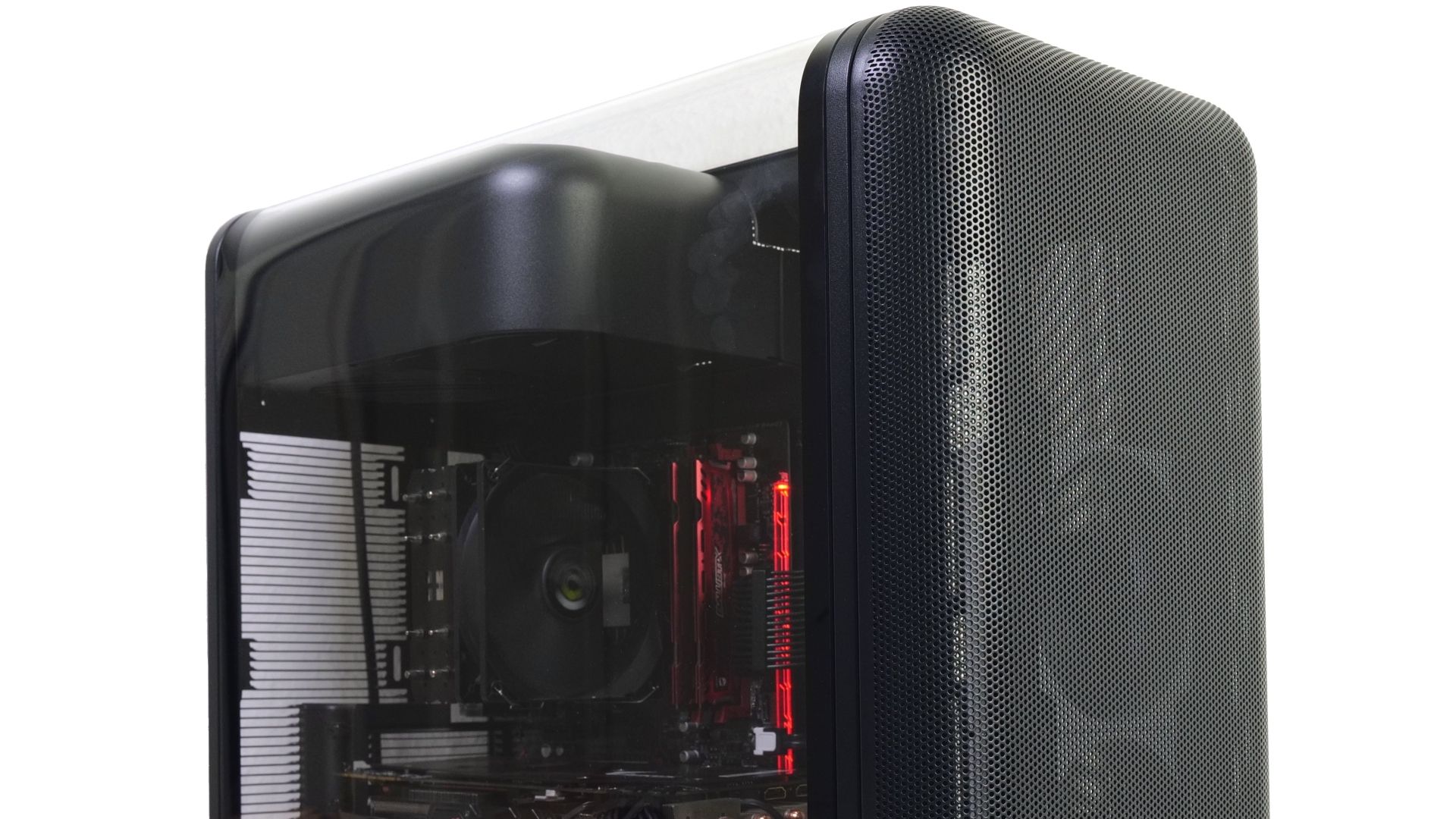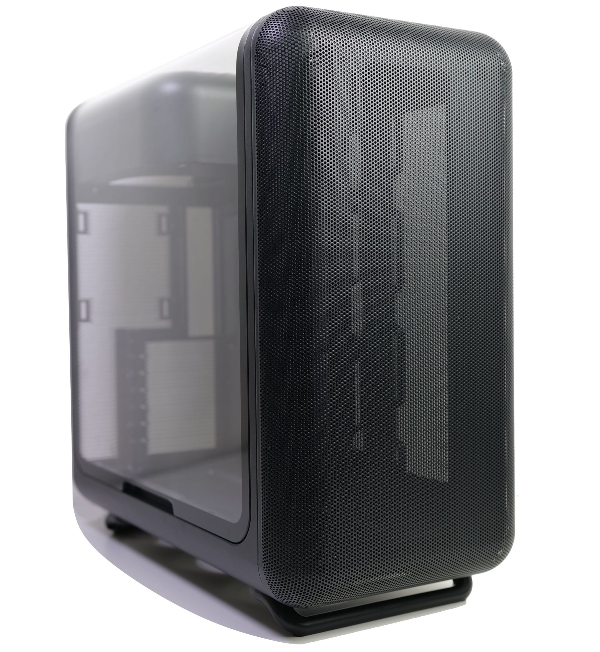 Doch Hyte ist es gelungen, für das X50 ein ganz eigenständiges Design zu entwickeln. Es wird vor allem von bemerkenswert konsequent eingesetzten Rundungen geprägt. Selbst die Seitenteile wölben sich zum Deckel hin. Dabei gibt es zwei Gehäusevarianten, die sich bei der Gestaltung des linken Seitenteils unterscheiden. Das reguläre X50 hat ein gewölbtes Glasseitenteil. Beim X50 Air wird hingegen ein perforiertes Stahlseitenteil verbaut. Gehäuselüfter werden generell nicht mitgeliefert, die Lüfterwahl bleibt also dem Nutzer überlassen. Hyte bietet das X50 nicht nur in einer schwarzen und einer weißen Farbvariante an, sondern hat auch bunte Varianten im Programm: Wild Cherry, Taro Milk, Strawberry Milk und Matcha Milk (rot, lila, rosa und hellgrün). Beim X50 Air gibt es hingegen nur die Wahl zwischen schwarzer und weißer Ausführung.