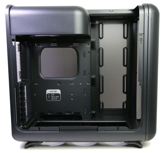 Hyte nutzt einen aktuell ungewöhnlichen Innenaufbau, bei dem der Netzteilkäfig oberhalb des Mainboards sitzt. Das Netzteil saugt Luft aus der Mainboardkammer an und befördert sie dann nach hinten aus dem Gehäuse. Auch im Innenraum sind runde Formen prägend - vor allem beim Netzteilkäfig, aber z.B. auch bei der Kühlermontageöffnung im Mainboardtray. Auffällig ist, dass keine Back-Connect-Mainboards unterstützt werden. Neben dem Mainboardträger zeigt sich eine seitliche Lüfter- und Radiatorenblende für drei 120-mm-Lüfter bzw. einen 360-mm-Radiator.