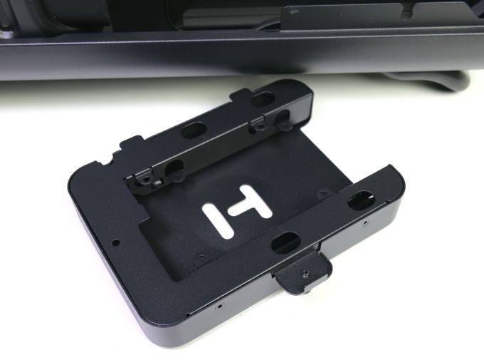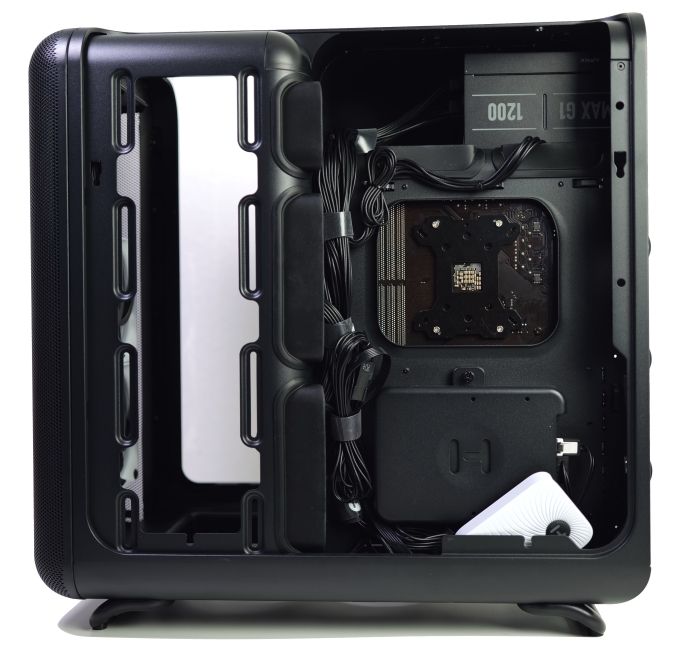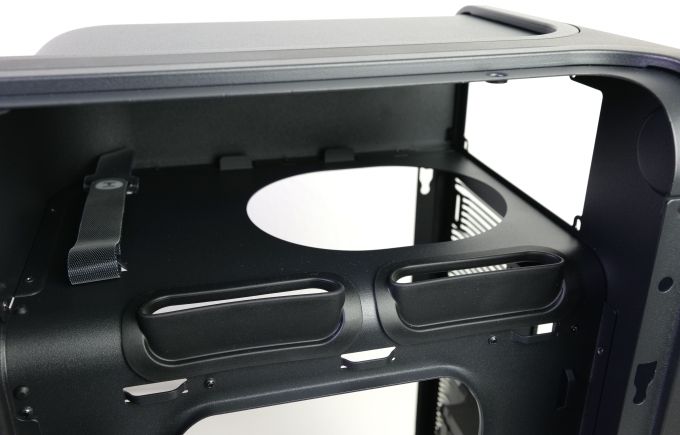 An der Mainboardträgerrückseite gibt es einen Kabelkanal mit Klettverschlüssen und einen Laufwerkskäfig. Selbst bei diesem Käfig und den Kabeldurchführungen (aus Silikon und laut Hyte farblich optimal an die jeweilige Gehäusefarbe angepasst) dominieren runde Formen.