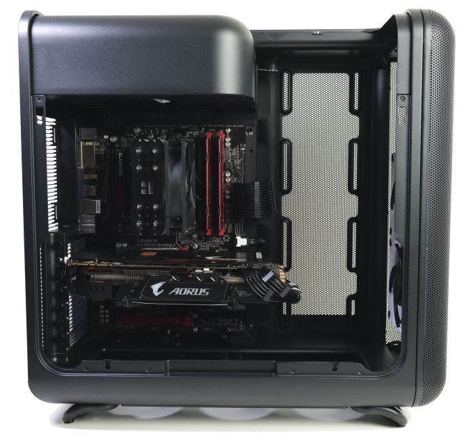 Das Netzteil wird seitlich ins Gehäuse geschoben und mit der Rückwand verschraubt. Aufgrund der ungewöhnlichen Position muss man damit rechnen, dass die Kabellängen aktueller Netzteile nicht ganz optimal sein können. Man benötigt z.B. nur sehr kurze 8-Pin-EPS-Stränge, aber längere Stromkabel für die Grafikkartenversorgung.