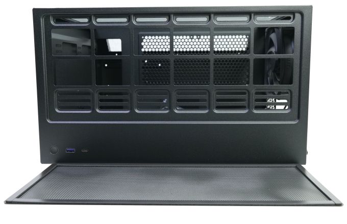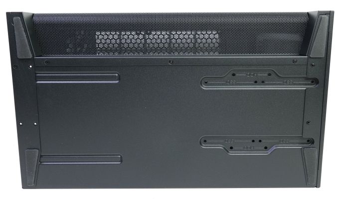 Das H3 Flow hat keine ausgeprägten Standfüße, sondern einfach Gummischoner, die unter dem Gehäuseboden kleben. Das Meshelement auf der linken Gehäuseseite wölbt sich zum Gehäuseboden hin und lässt dabei etwas Luft. Am Boden sind auch die unterschiedlichen Montageplätze sichtbar, die man für Laufwerke nutzen kann.
