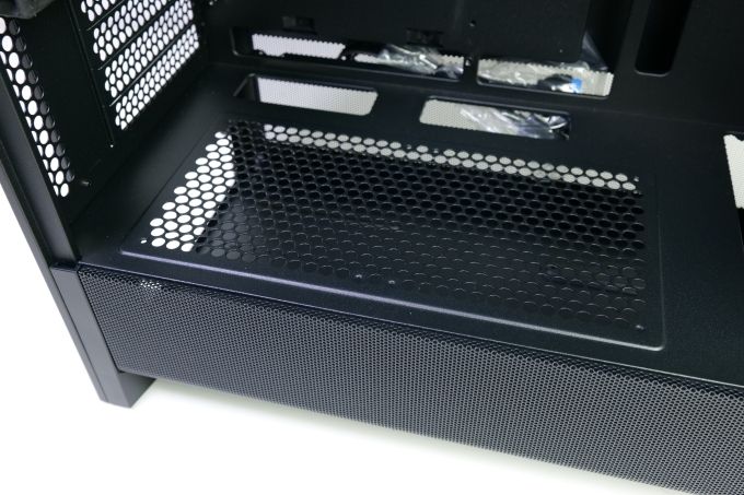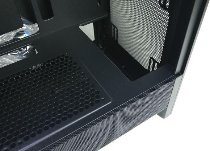 Im vorderen Bereich der Netzteilabdeckung erlaubt eine Aussparung die Nutzung eines Dual-Frontradiators. Sie ist etwa 6,5 cm breit.