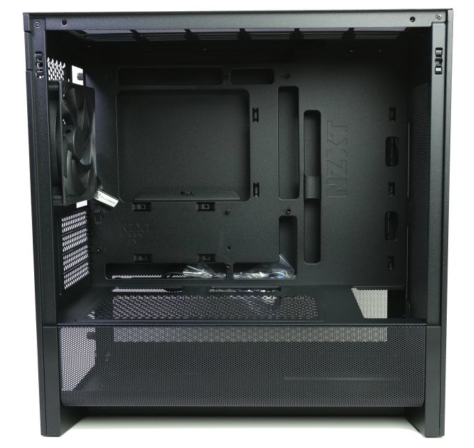 Das H3 Flow ist zwar ein Mini-Tower für Micro-ATX-Mainboards, NZXT nutzt aber den gleichen Aufbau, den man auch von den meisten aktuellen Midi-Towern her kennt. Es gibt also eine Mainboardkammer und eine kleinere zweite Kammer für Netzteil und Laufwerke. Dabei ist diese Bodenkammer allerdings weniger strikt abgetrennt und durch das Metallgitter sogar etwas von außen einsehbar.