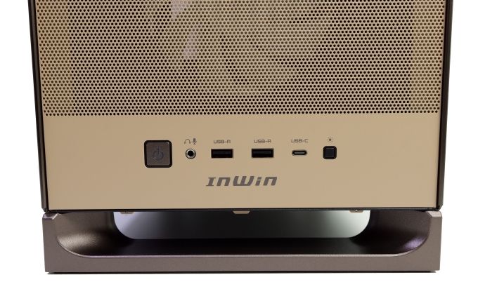 Das I/O-Panel wurde bodennah in die Front integriert. Dabei rahmen die Power- und die LED-Taste die Anschlüsse ein. Man kann eine kombinierter Klinkenbuchse, zwei USB-A-Ports und einen USB-C-Port nutzen.