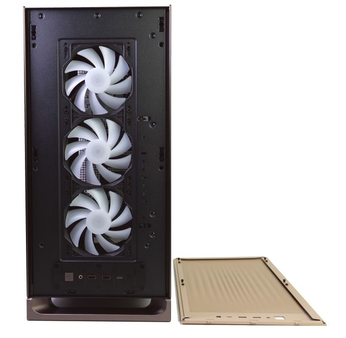 Die Stahlfront lässt sich einfach vom Gehäuse abziehen. Dahinter sitzen drei 120-mm-Lüfter vom Typ XM120, bei denen die Rotoren von A-RGB-LEDs beleuchtet werden. Alternativ kann hinter der Front maximal ein 360-mm-Radiator verbaut werden.