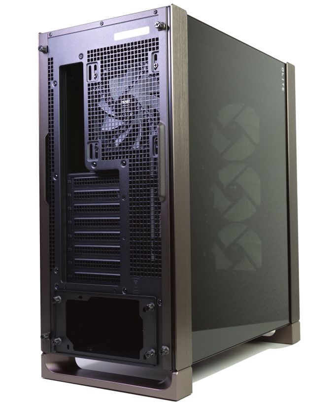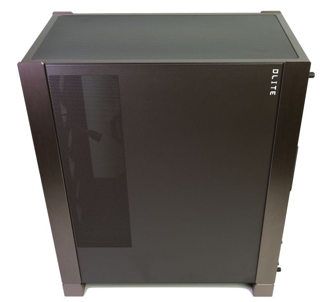Glas- und Stahlseitenteil werden links und rechts jeweils von Aluminiumzierleisten eingefasst. Auf beiden Seitenteilen gibt es zudem einen DLITE-Schriftzug. Luftlöcher zeigen sich hingegen nur im Stahlseitenteil. Sie dienen als Lufteinlass für die optionalen Seitenlüfter. Einen zusätzlichen Staubfilter gibt es genauso wie bei der Front nicht. Für die ebenfalls optionalen Deckellüfterplätze setzt In Win hingegen ein Staubgitter ein.