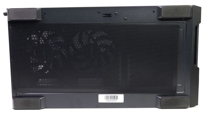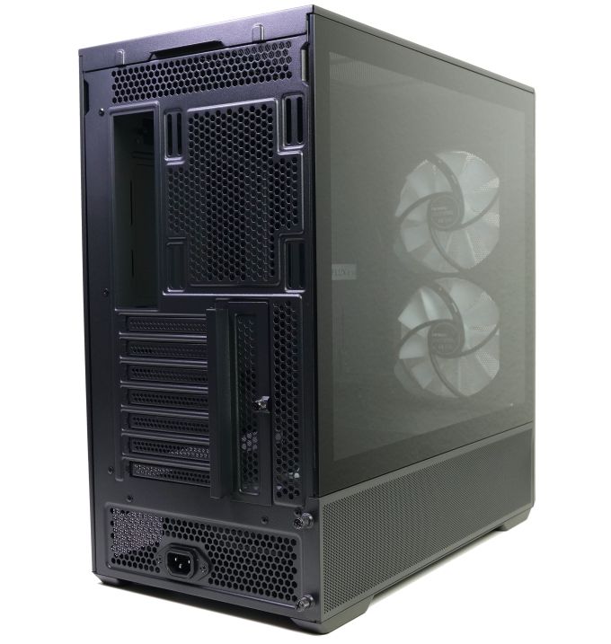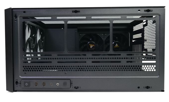Dieser Radiatoren-/Lüfterplatz ist ab Werk unbelegt, Antec selbst sieht aber klar die Montage des mitgelieferten 140-mm-A-RGB-Lüfters vor. Unter dem Lüfterplatz können sieben horizontale Erweiterungskartenslots genutzt werden. Die Erweiterungskarten werden mit Kreuzschlitzschrauben montiert, darüber sitzt ein Winkelblech, das von einer Rändelschraube an seinem Platz gehalten wird. Zwei weitere Rändelschrauben fixieren die Meshfläche auf der linken Gehäuseseite an der Rückwand. Die beiden Seitenteile sind hingegen angeclipst, sie können also direkt vom Korpus abgezogen werden. Das wird durch eine kleine Griffmulde knapp unter dem Gehäusedeckel erleichtert. Einen Netzteilplatz gibt es wegen des speziellen Layouts an der Rückwand nicht. Stattdessen wird das Kaltgerätekabel an einer Buchse angeschlossen und ins Gehäuseinnere verlängert.