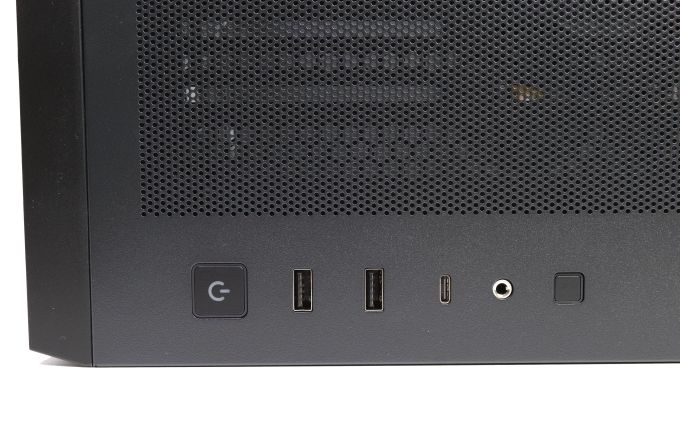 Auf der rechten Seite des Deckelmeshs sitzen die Bedientasten (Power und Reset) und das I/O-Panel mit zweimal USB 3.0, einmal USB-C und einer kombinierten Audiobuchse.