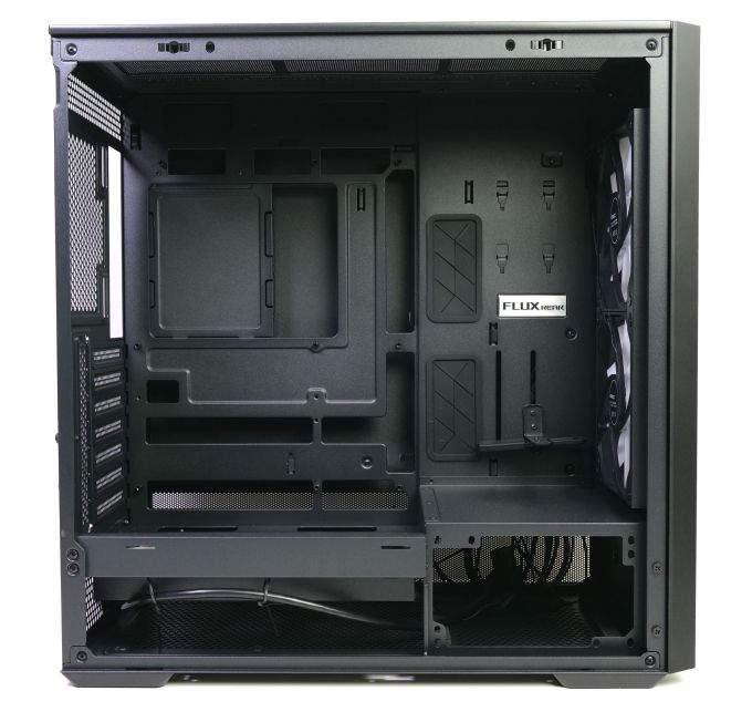 Der Innenraum des Flux Rear weicht deutlich von dem der meisten anderen aktuellen Midi-Tower ab. Das liegt primär an der ungewöhnlichen Gestaltung der unteren Kammer: Die eigentliche Netzteilkammer befindet sich direkt hinter der Front, die Netzteilblende zeigt dabei nach links. Die Verlängerung des Kaltgerätekabels wird entsprechend seitlich angeschlossen. Sie verschwindet dann genau wie der Netzteilschalter hinter dem seitlichen Meshelement.