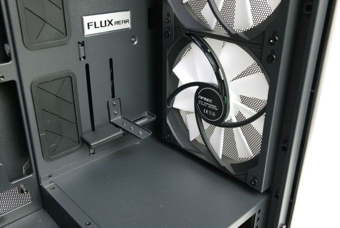 Bei Gehäusen mit quer montiertem Netzteil ist die Netzteillänge oft ein kritischer Faktor. Laut Antec soll das Flux Rear aber immerhin bis zu 17 cm lange Netzteile aufnehmen können. Dabei bleiben dann noch etwa 4 cm Platz für die Netzteilkabel. Das 14 cm lange Netzteil unseres Testsystems fand sehr komfortabel Platz. An die Netzteilabdeckung schließt eine abgesenkte Abdeckung an, die vor allem als Lüfterblende dient. Zwischen beiden Abdeckungen gibt es eine Stufe. Beim Blick auf den Mainboardträger fällt die Auslegung für Back-Connect-Mainboards auf. Unterstützt werden dabei aktuell Modelle von ASUS, MSI und Colorful.