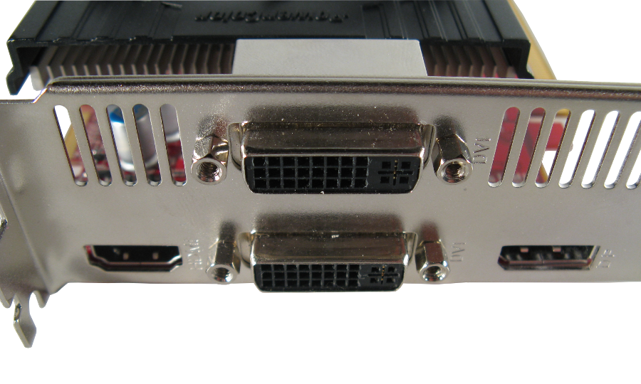 Auf dem Slotblech stehen mit DVI, HDMI und DisplayPort-Anschluss die üblichen Vertreter bereit. Beim näheren Hinsehen könnte einem die ungewohnte Anordnung dieser auffallen. So rückten die beiden DVI-Anschlüsse in die Mitte, während HDMI und DP jeweils am äußeren Rand angebracht wurden.