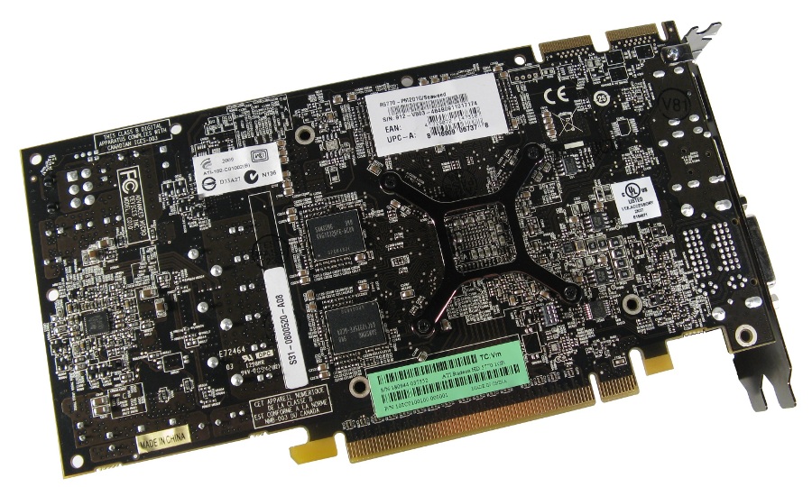 Wie so häufig birgt die Rückseite der MSI Radeon HD 5770 keine großen Geheimnisse. Das Printed Circuit Board (PCB) misst seine gewohnten 21 cm und kommt im Schwarz-Braunen Outfit daher.