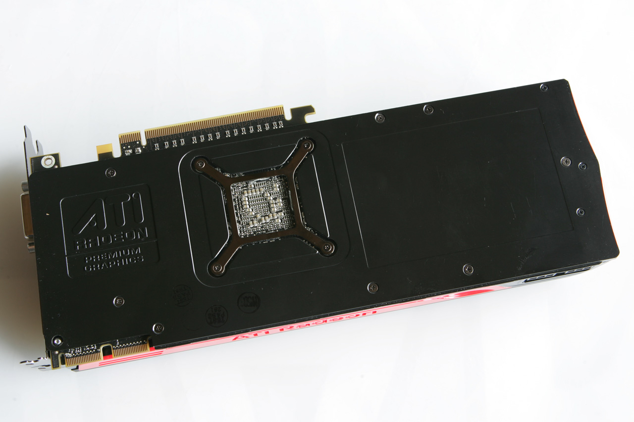 Auch die Rückseite lässt eigentlich keine Schlüsse zu, dass es sich um ein kleineres Modell als eine Radeon HD 5870 oder 5850 handelt. Eine Metallplatte schützt die Bauteile. Somit ist weder auf der Vorder- noch auf der Rückseite etwas von der eigentlichen Hardware zu sehen.