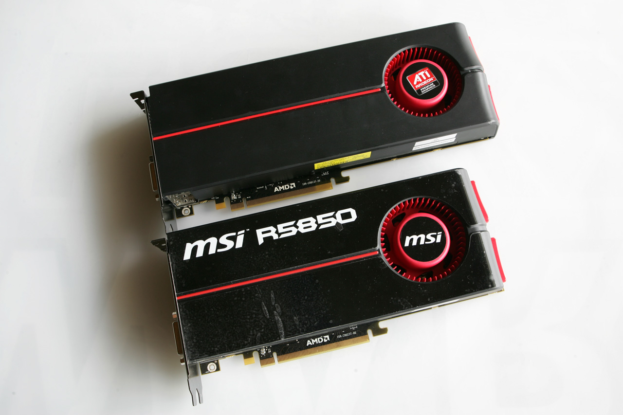 Hier einmal im direkten Vergleich die ATI Radeon HD 5830 (oben) und die ATI Radeon HD 5850 (unten). Man darf sich also die Frage stellen, warum eine in der Leistung darunter angesiedelte Karte größere Ausmaße besitzt.
