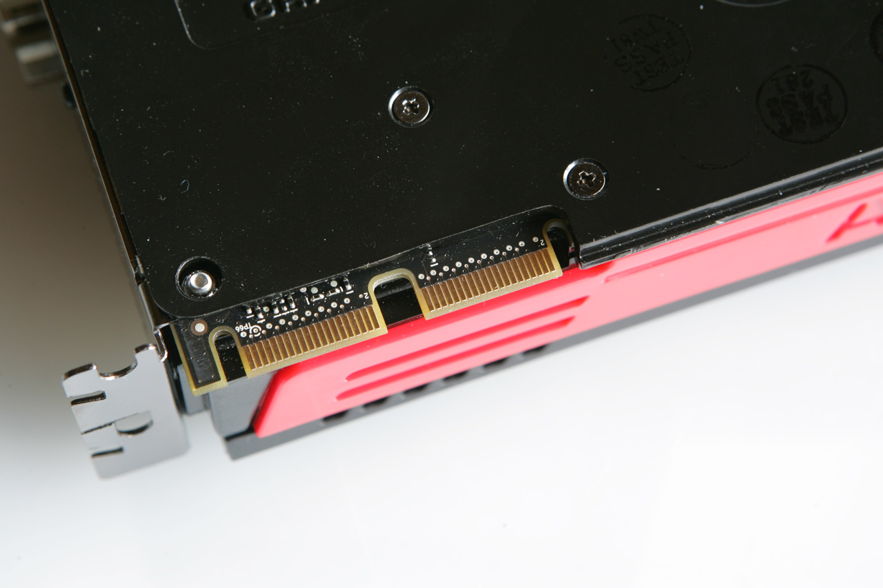 Natürlich lassen sich auch zwei ATI Radeon HD 5830 in einem CrossFire-Verbund zusammenfassen. Zu diesem Zweck sind zwei Anschlüsse für die CrossFire-Brücken vorhanden.