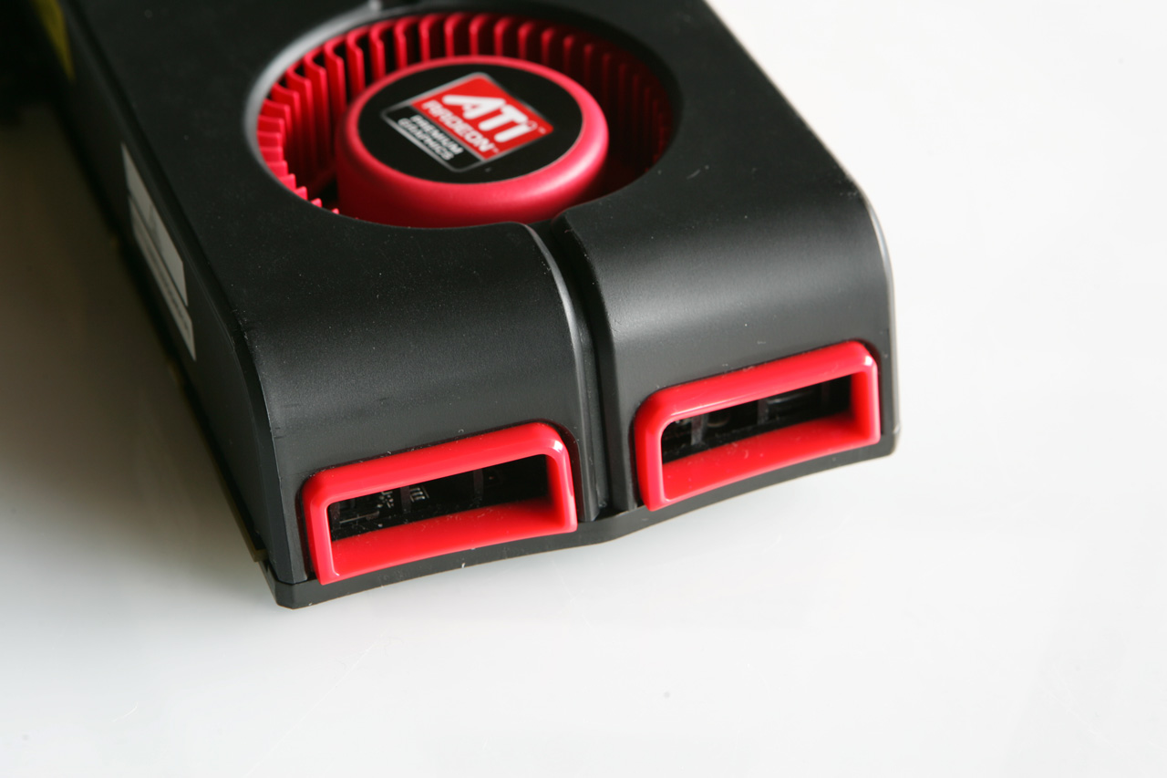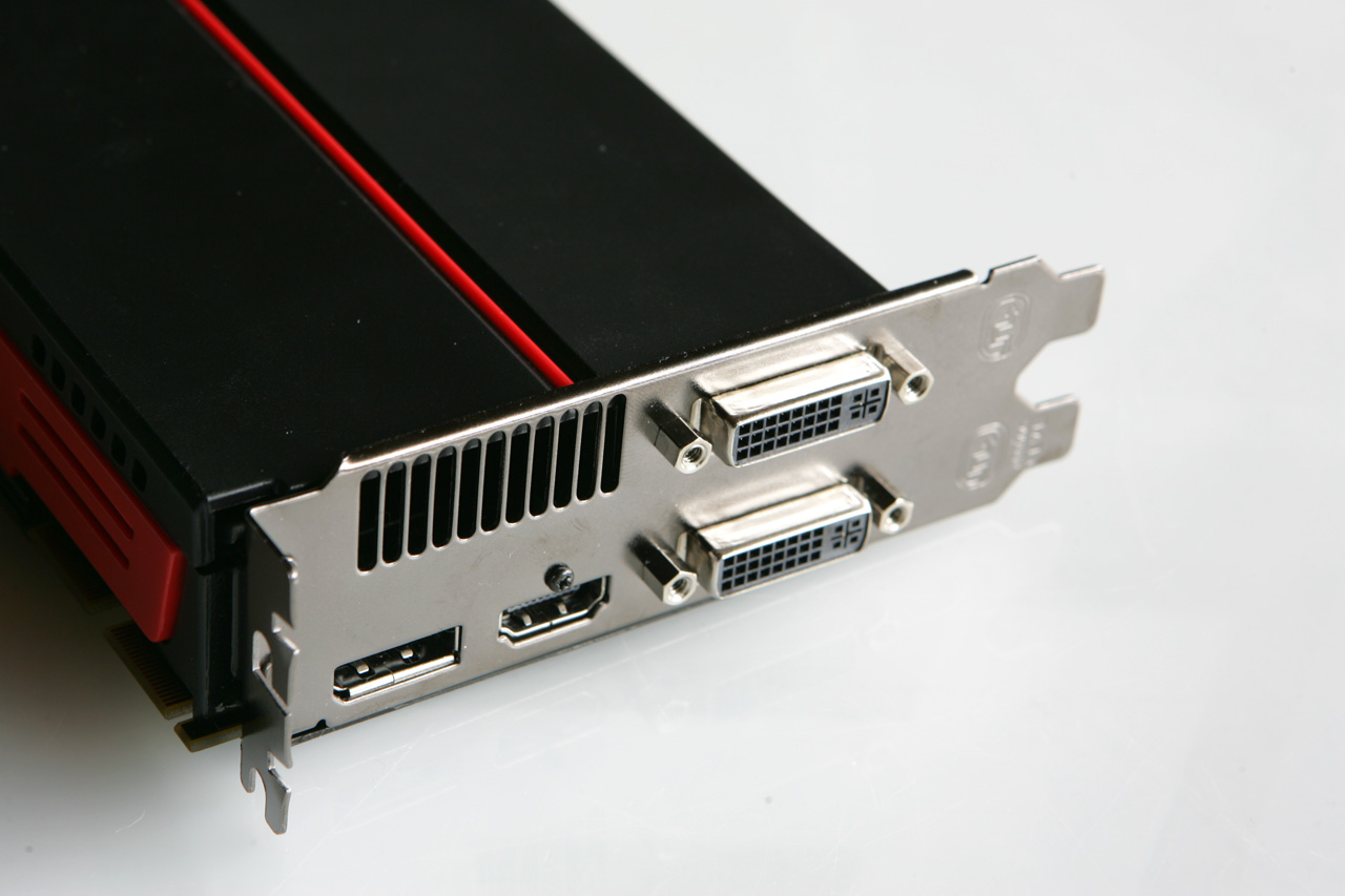 Da es sich um einen Dual-Slot-Kühler handelt, bleibt AMD an den PCI-Blenden genügend Platz gleich zwei Dual-Link-DVI-, einen HDMI-Anschluss sowie einen DisplayPort zu realisieren. Hier auch zu sehen ist die Öffnung, durch welche die warme Luft aus dem Gehäuse geblasen wird.