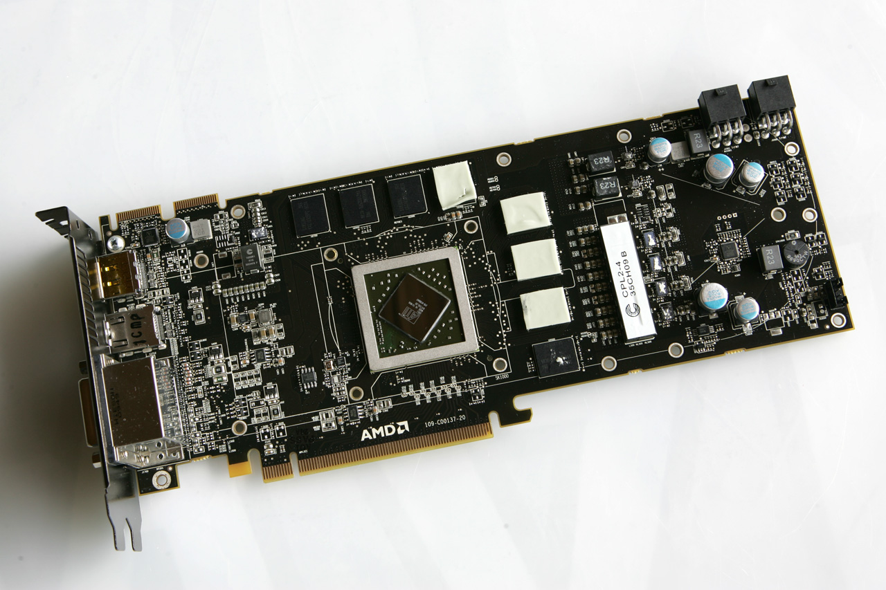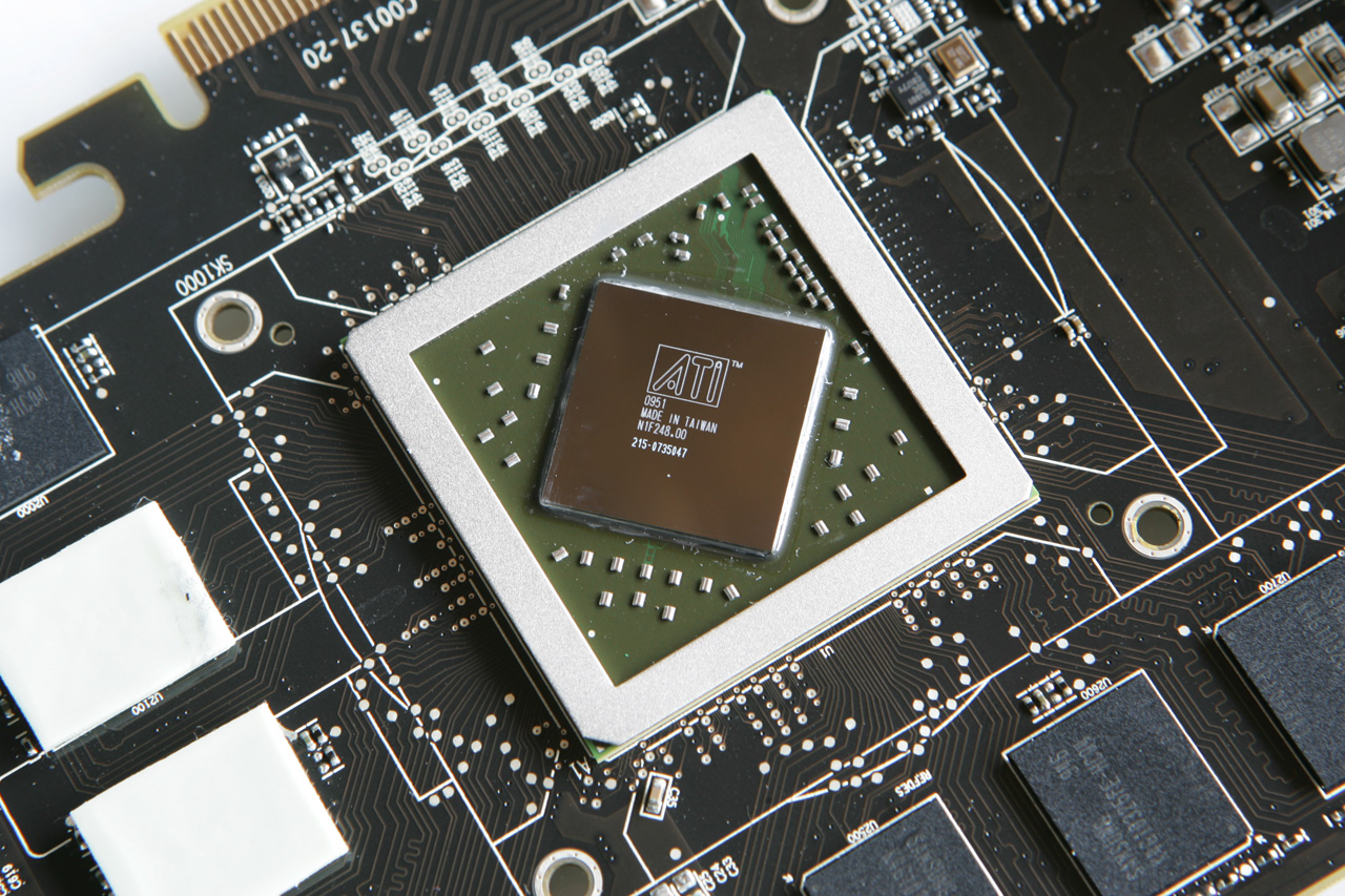 Von zwei Seiten durch die Speicherchips eingebettet findet sich die RV870-GPU. Sie arbeitet mit einem Takt von 800 MHz.