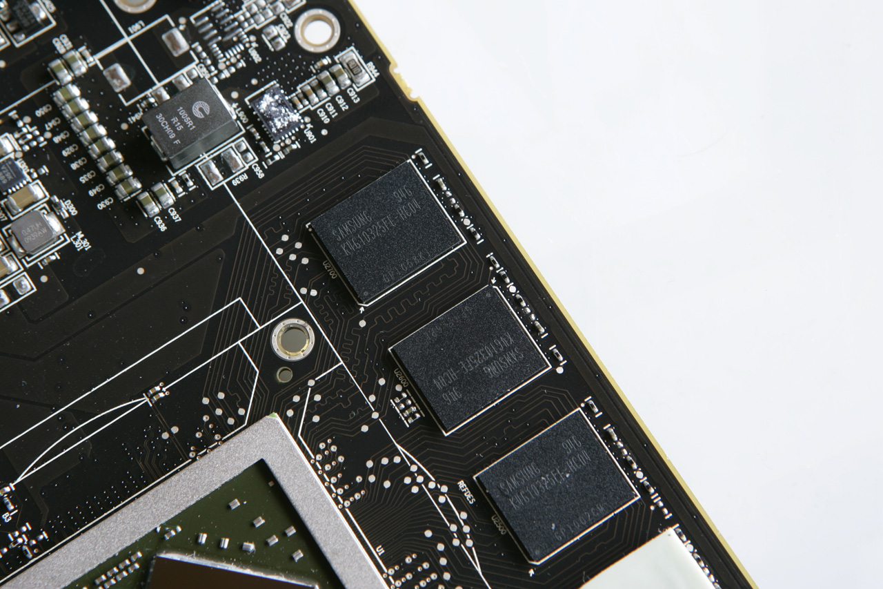 Insgesamt verfügt die ATI Radeon HD 5830 über 1024 MB GDDR5-Speicher. Dieser ist in acht einzelne Chips aufgeteilt, die entsprechend über eine Kapazität von jeweils 128 MB verfügen. Wie bereits auf der ersten Seite des Artikels erläutert, arbeiten sie mit einem Takt von 1000 MHz.