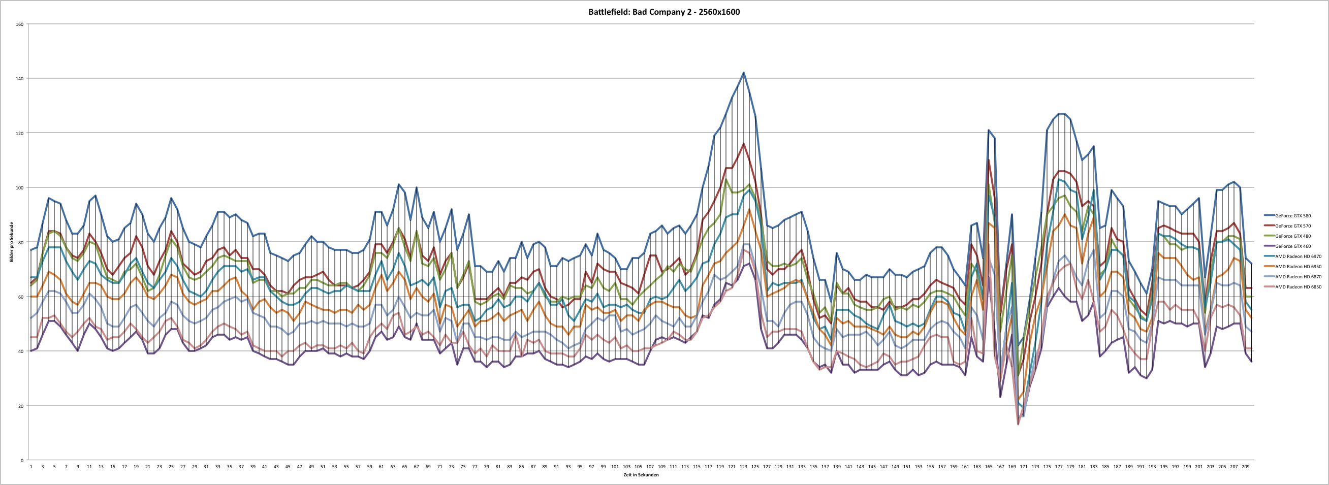 Zum Abschluss noch ein Blick auf den Frameverlauf unter Battlefield Bad Company 2. Dazu starten wir eine neue Kampagne und zeichnen die ersten 210 Sekunden auf.