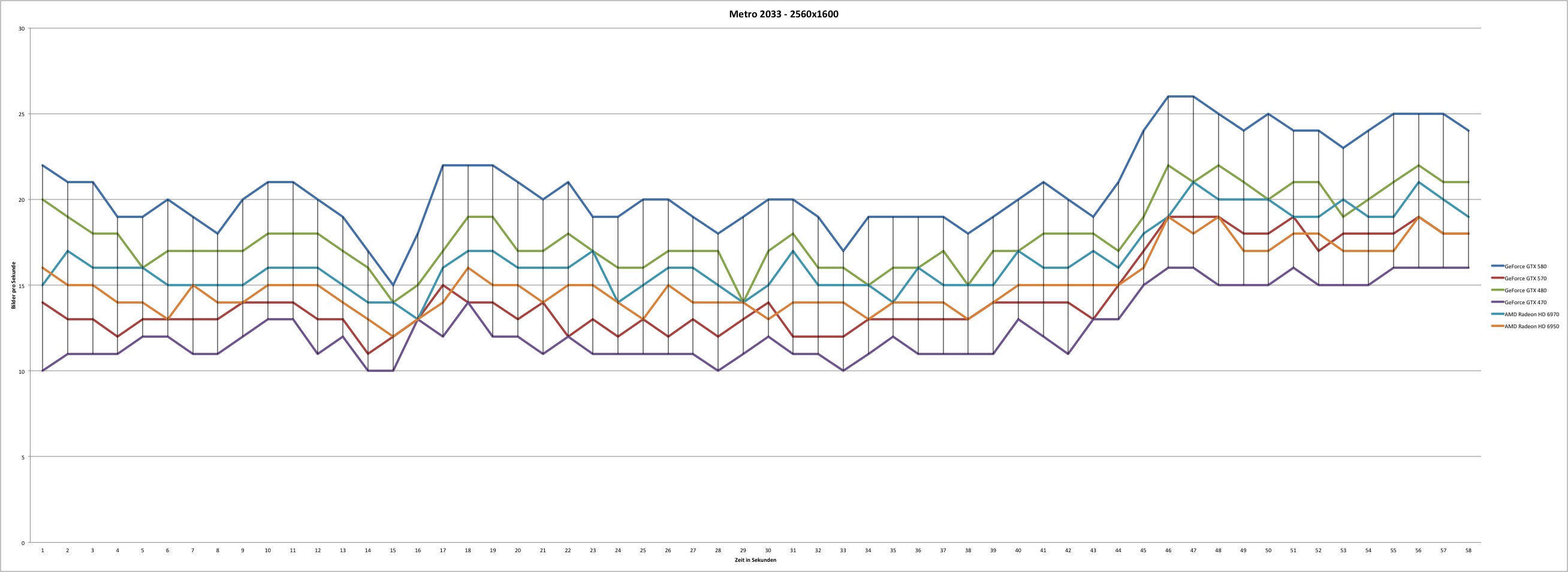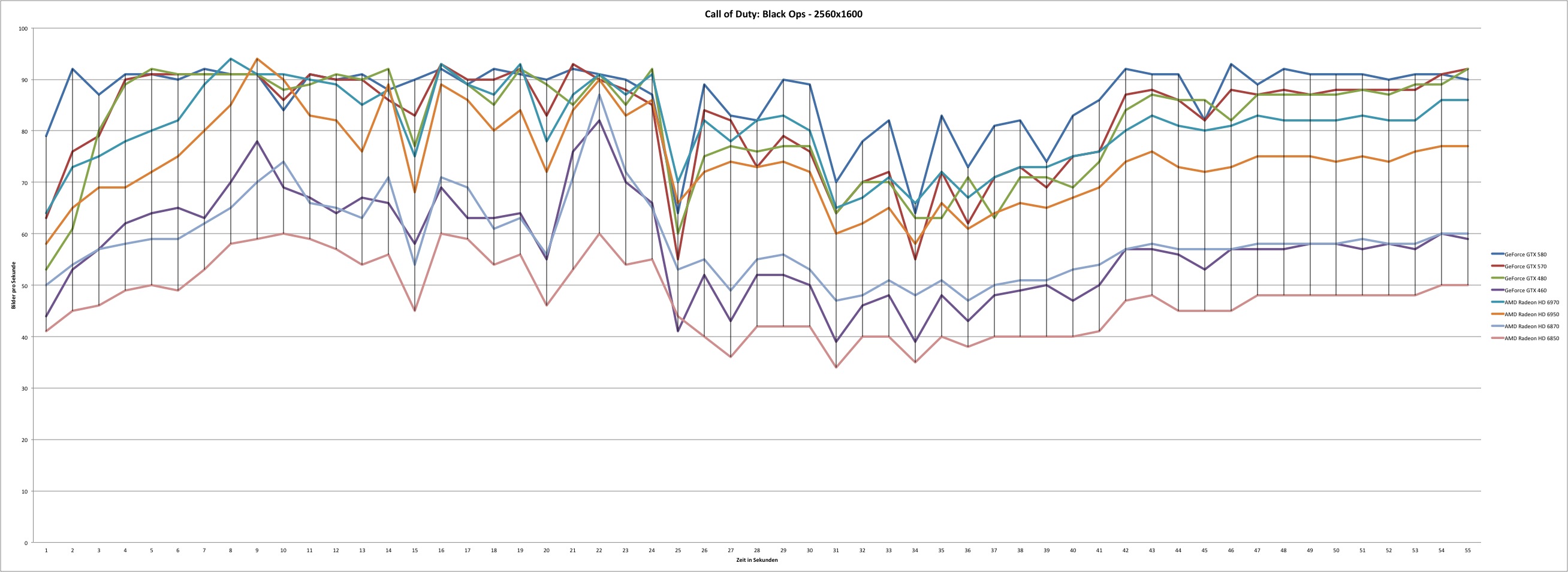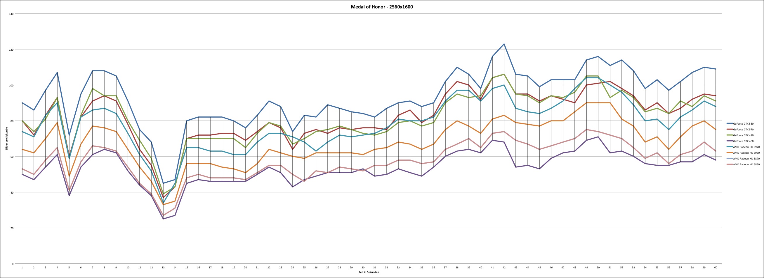 Bei den Verlaufsdiagrammen beginnen wir mit dem neuesten Titel aus der Medal-of-Honor-Reihe. Bei diesem starten wir die Mission "Grüße aus Bagram" und lassen Fraps die ersten 60 Sekunden bei einer Auflösung von 2560x1600 Pixeln aufzeichnen.