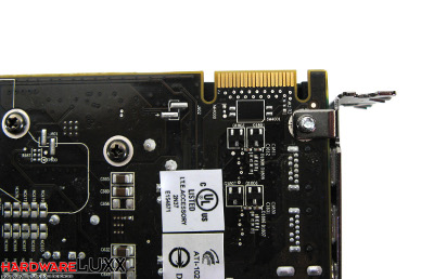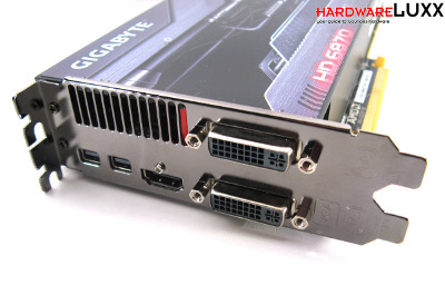 Auf dem Dual-Slot-I/O-Shield werden zwei DVI-Ausgänge, ein HDMI-Port und zwei weitere mini-DisplayPort-Anschlüsse sichtbar. Damit bietet das Testmuster mehr als genug Anschlussmöglichkeiten, um dank Eyefinity-Support bis zu sechs Monitore anzusteuern.
