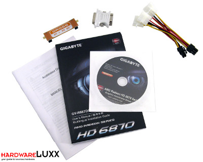 Im Lieferumfang der Gigabyte Radeon HD 6870 befindet sich einiges an Zubehör. Neben einem Handbuch samt Treiber-CD, einem Quickstart-Guide und dem üblichen DVI/VGA-Adapter liegen auch zwei Adapter für die Stromversorgung der Grafikkarte und eine CrossFire-Brücke mit im Karton. Einen actionreichen DirectX-11-Titel, wie man ihn bei zahlreichen Vorgänger-Grafikkarten finden konnte, ist leider nicht enthalten.