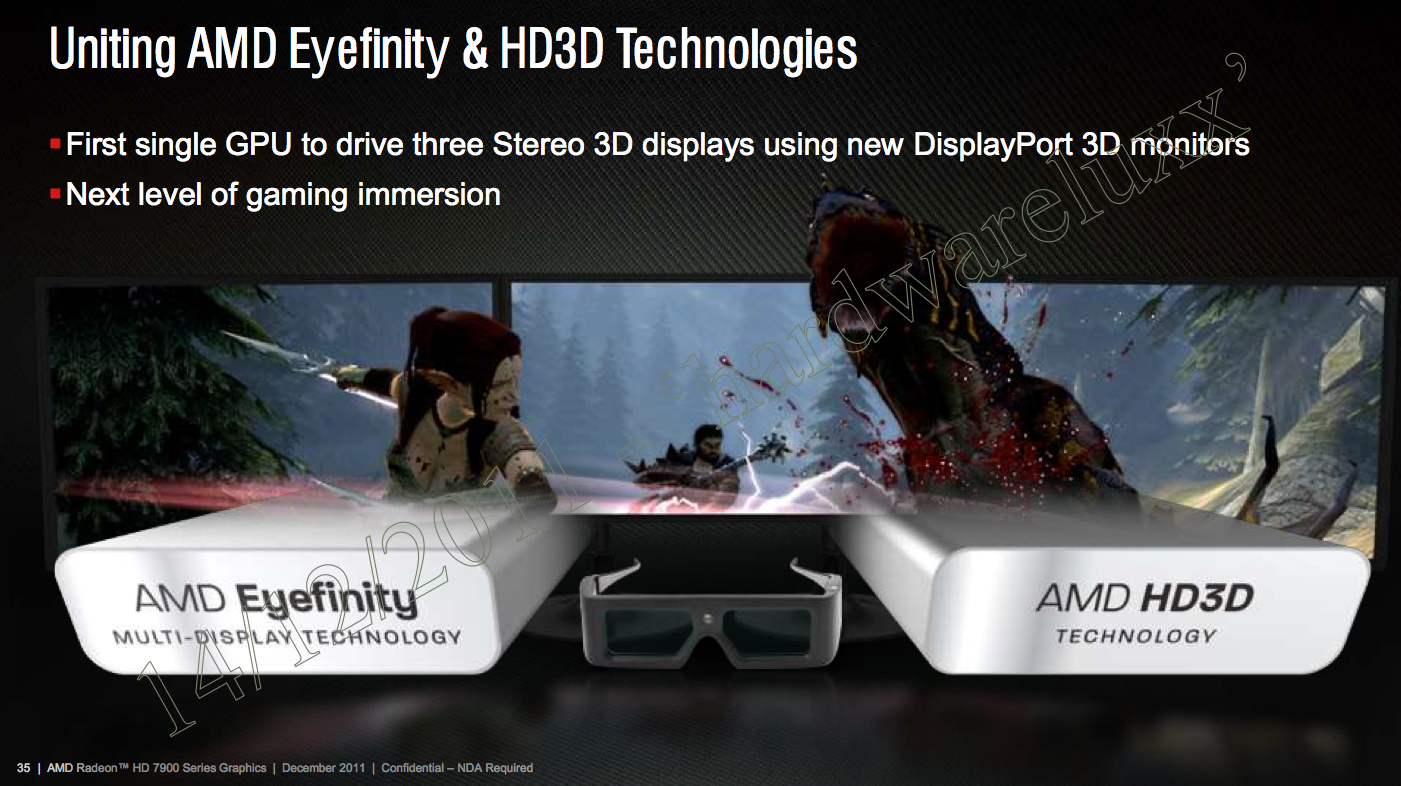Mit einer neuen Hardware gehen oftmals auch neue Software-Features einher. Eines davon ist die nächste Iteration von Eyefinity. Mit Eyefinity 2.0 ist es nun möglich nicht nur das Spielgeschehen auf bis zu sechs Displays darstellen, sondern dies auch in HD3D zu tun. Der HDMI-Anschluss bietet den Support der HDMI-Spezifikation 1.4a und erlaubt somit auch die Darstellung von 3D-Inhalten in 1080p bei 60 Hz pro Auge. Über diesen und die DisplayPort-Anschlüsse wird es zukünftig auch möglich sein 4K-Displays anzusteuern.