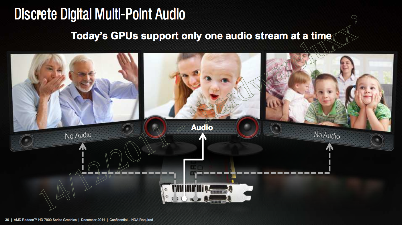 Zudem ist es mit Eyefinity 2.0 möglich bis zu drei unterschiedliche Audio-Streams an drei verschiedene Displays zu liefern. DDMA (Discret Digital Multi-Point Audio) ist natürlich nur über HDMI und DisplayPort möglich. Der Support von Eyefinity 2.0 wird mit dem aktuellen Catalyst 11.12 eingeführt. Dieser bietet allerdings noch keinen CrossFire-Support, der erst mit dem Catalyst 12.1 folgt. Die Catalyst-Version 12.2 soll dann auch benutzerdefinierte Auflösungen wie beispielsweise 2400x600, 3840x720 oder 5760x1200 Pixel bieten. Dann wird es ebenfalls möglich sein die Taskleiste beliebig zu platzieren und diese nicht nur auf den rechten Display darzustellen.