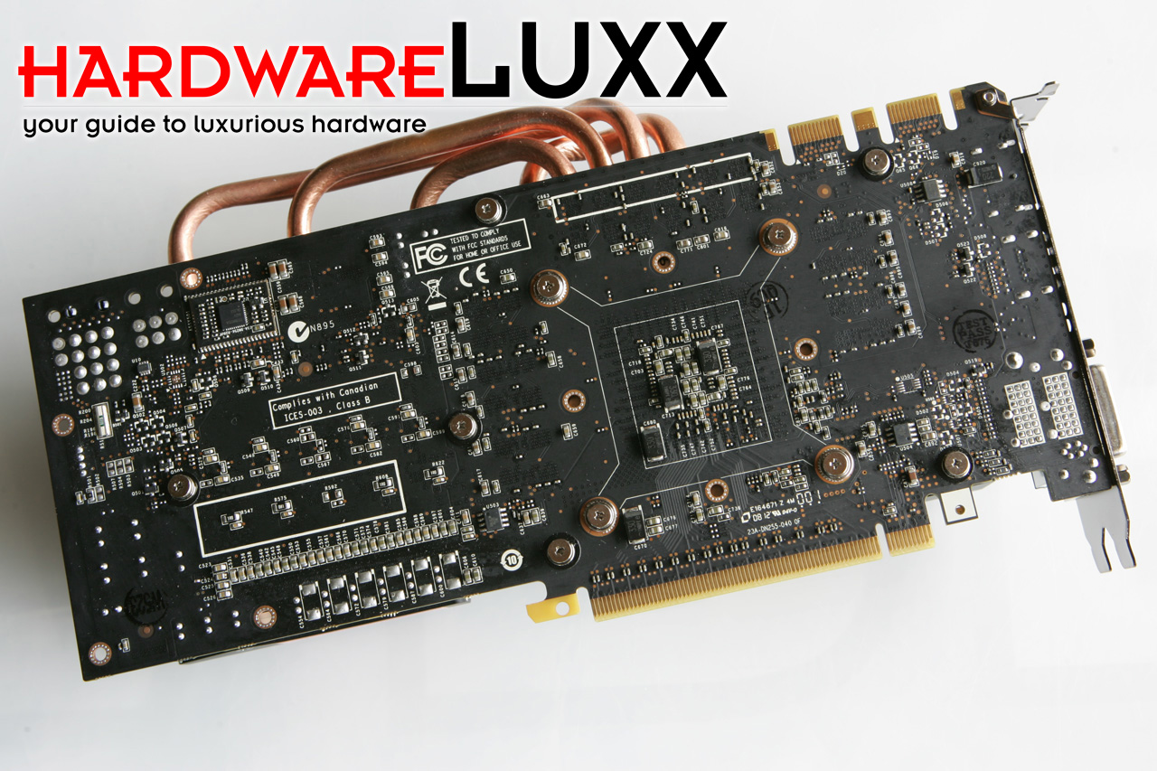 Bei einem Blick auf die Rückseite des PCBs verschwindet der Kühler bis auf die bereits erwähnten Heatpipes aus Kupfer nahezu gänzlich. Eines wird nun aber auch klar: Zotac verwendet das PCB im Referenzdesign auf der GeForce GTX 680 AMP! Edition.