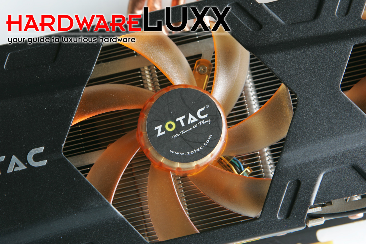 Zwei 75-mm-Lüfter sitzen eingefasst in einem luftigen Rahmen und sollen für ausreichend Frischluft sorgen. Einer der beiden Rotoren ist dabei direkt über der GPU platziert worden, während der zweite am hintere Ende der Karte sitzt, wo die Heatpipes in den Heatsink eingelassen werden.