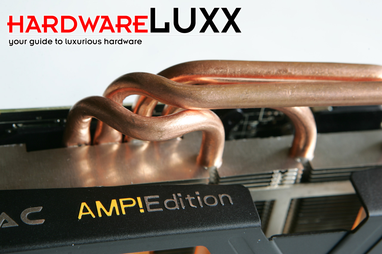 An der Oberseite der Karte führt Zotac den "AMP! Edition"-Schriftzug und leitet auch die vier Heatpipes aus dem eigentlichen Kühler heraus, um sie dann in den Heatsink einzuleiten. Ob die Heatpipes direkt auf der GPU aufsitzen oder in der Bodenplatte eingefasst sind, klären wir später.