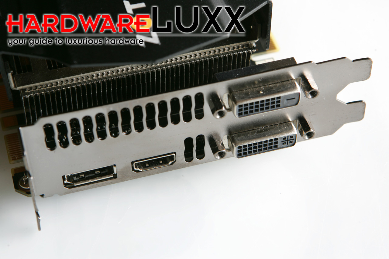 Auf der Slotblende bietet sich übliche GTX-680-Kost: zu sehen sind jeweils ein Dual-Link-DVI-I und DVI-D sowie HDMI und DisplayPort. Durch die Schlitze in der Blende soll ein Teil der warmen Luft entweichen. Da Zotac den Luftstrom aber nicht deutlicher in diese Richtung lenkt, entweicht nur ein sehr kleiner Teil der warmen Abluft.