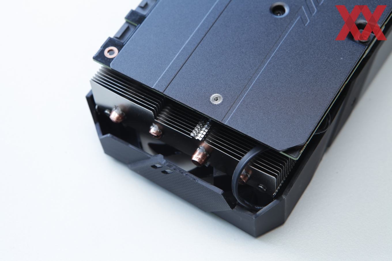 Der Kühler der Gigabyte GeForce RTX 2080 Gaming OC 11G steht am hinteren Ende der Karte etwas über das PCB hinaus. An dieser Stelle sind auch die verlöteten Heatpipes zu erkennen, die an dieser Stelle im Kühlkörper aus Aluminium enden.