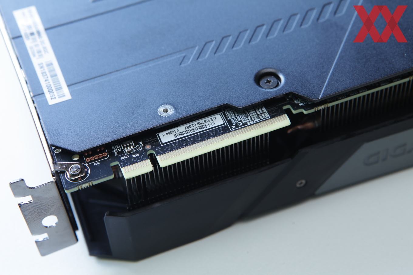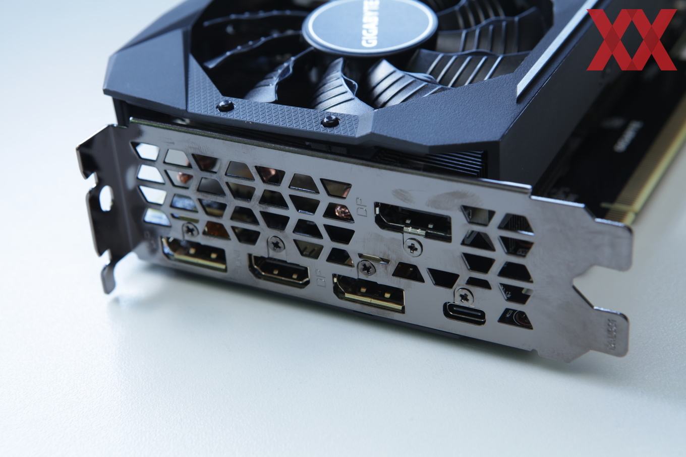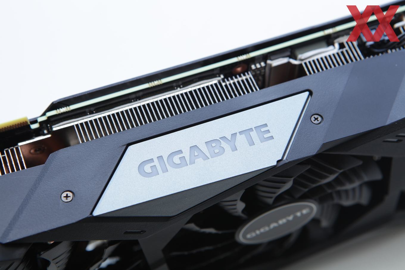 Auf der Stirnseite der Karte befindet sich ein beleuchtetes Gigabyte-Logo, welches via Software auch farblich gesteuert werden kann. Auf allzu viel RGB-Schnick-Schnack verzichtet Gigabyte bei diesem Modell aber und wird erst mit der AORUS-Serie darauf setzen.
