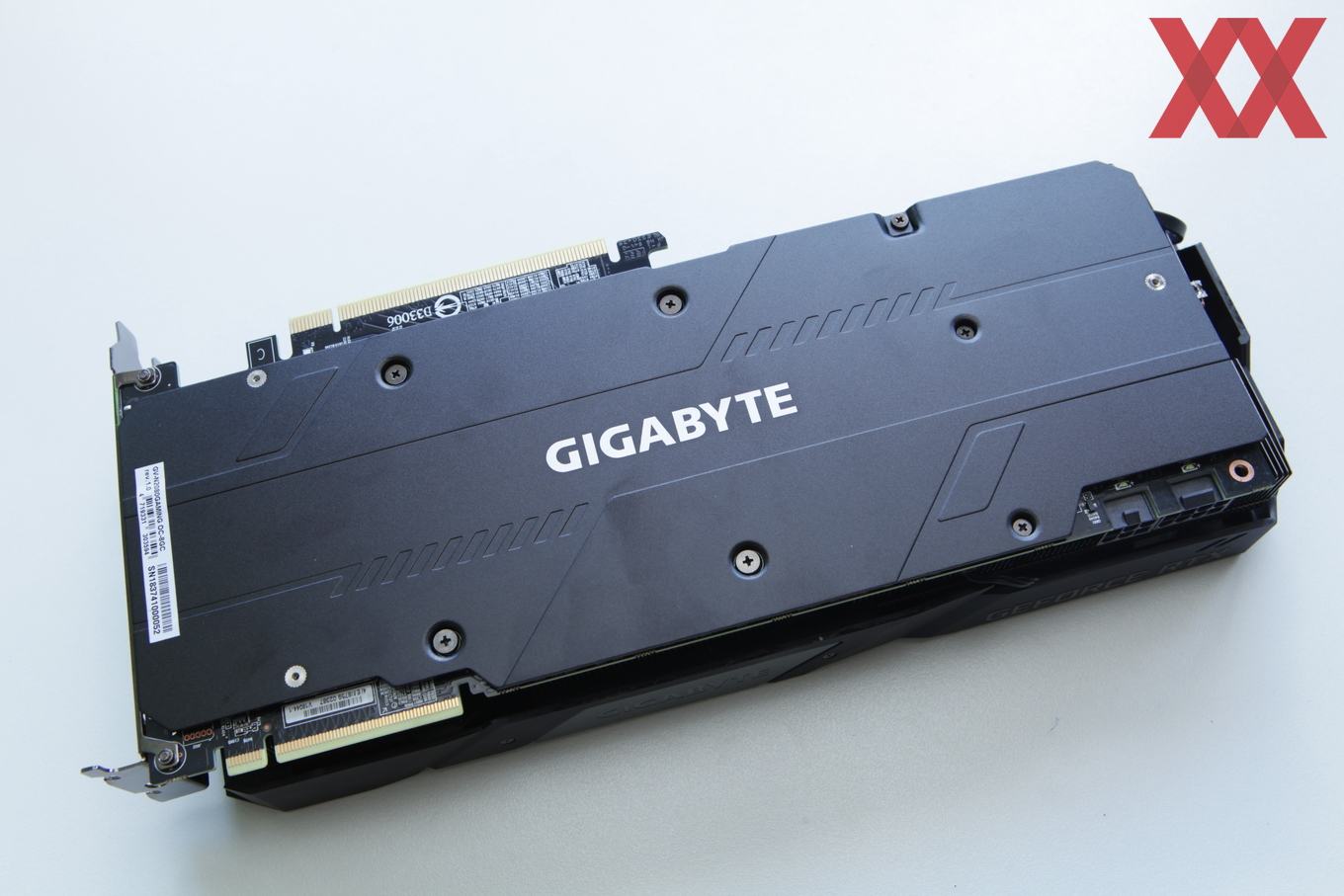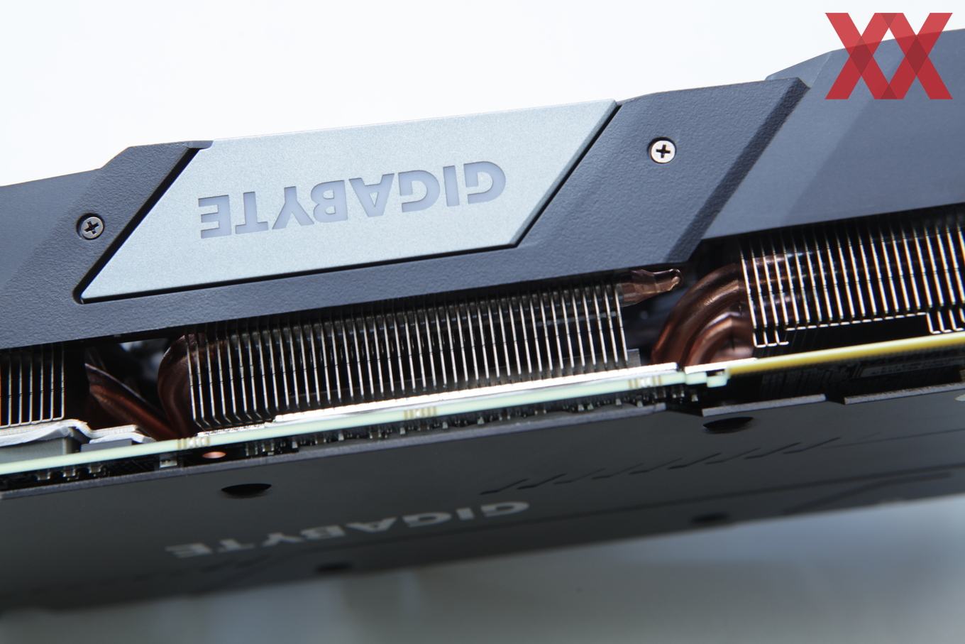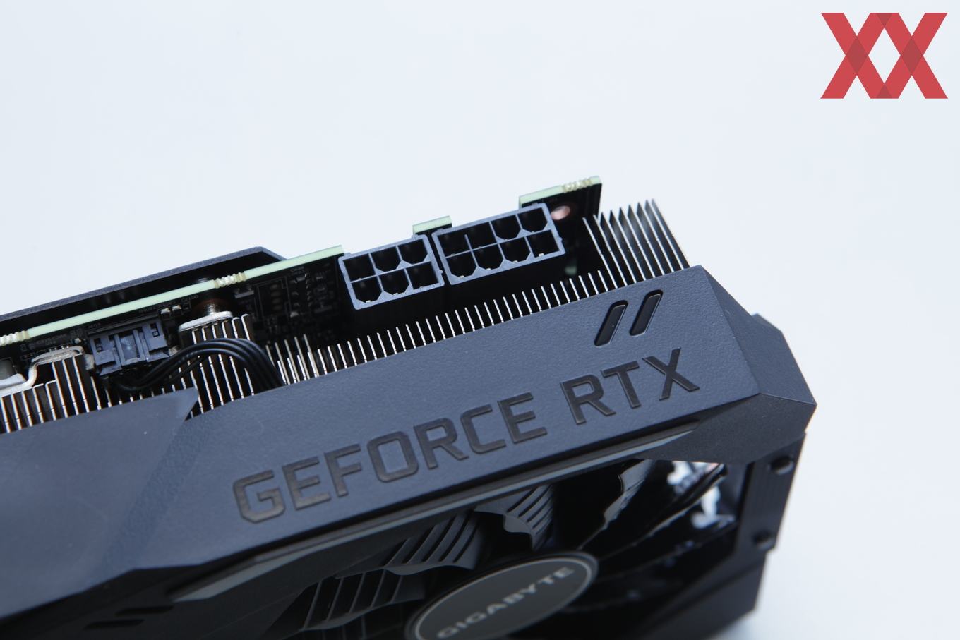 Auf der Stirnseite der Karte befindet sich ein beleuchtetes Gigabyte-Logo, welches via Software auch farblich gesteuert werden kann. Auf allzu viel RGB-Schnick-Schnack verzichtet Gigabyte bei diesem Modell aber und wird erst mit der AORUS-Serie darauf setzen.