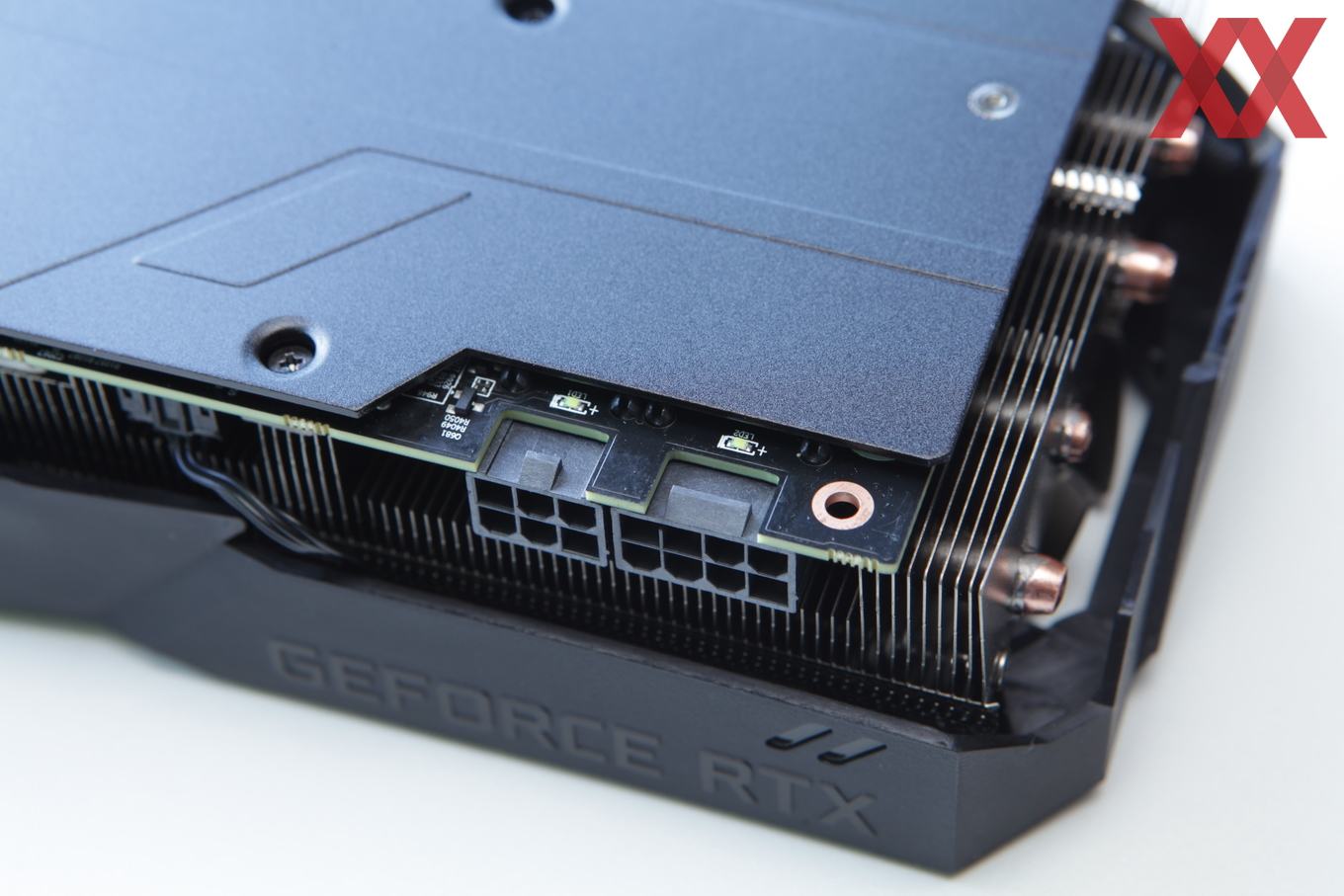 Die zusätzliche Stromversorgung der Gigabyte GeForce RTX 2080 Gaming OC 11G erfolgt wie bei der Founders Edition über jeweils einen 6-Pin- und einen 8-Pin-Anschluss. Damit können maximal 300 W an die Karte geführt werden. Selbst bei einer angehobenen Thermal Design Power auf 245 W ist also noch ausreichend Luft vorhanden. Auch Gigabyte verbaut pro Anschluss eine LED, welche signalisiert, wenn der Anschluss korrekt eingesteckt ist.