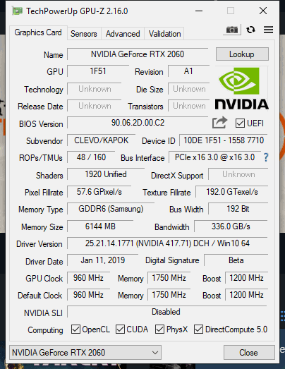 Den Einstieg in die Welt der RTX-Grafikkarten auf Turing-Basis im Notebook gewährt die GeForce RTX 2060. Sie baut ebenfalls auf der TU106-GPU auf, wurde jedoch abermals abgespeckt und stellt 1.920 Shadereinheiten sowie einen 6 GB großen GDDR6-Videospeicher mit 192 Datenleitungen bereit. Die Taktraten werden mit 960 bzw. mindestens 1.200 MHz angegeben. Damit fällt die Taktreduzierung gegenüber dem Desktop-Modell am größten aus. Die reguläre GeForce RTX 2060 rechnet mit 1.365 bis mindestens 1.680 MHz.