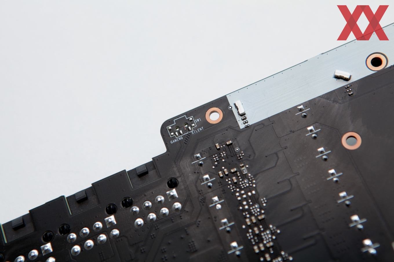 Offenbar plante MSI auch einen BIOS-Switch, den man für die GeForce RTX 3080 Gaming X Trio 10G aber nicht umgesetzt hat. Die Beschriftung auf dem PCB legt einen Gaming- und Silent-Betrieb nahe. Rechts in der weißen Markierung sind die RGB-LEDs platziert, die auf der Stirnseite der Karte sichtbar sind.