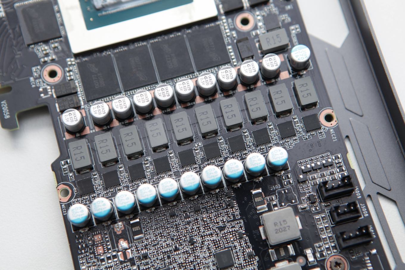 Im hinteren Bereich des PCBs ebenfalls zu erkennen sind einige Shunt-Widerstände, die dazu genutzt werden die Leistungsaufnahme über die zusätzlichen Anschlüsse zu messen, sodass das Power-Management der Karte das Power-Limit entsprechend berechnen kann.