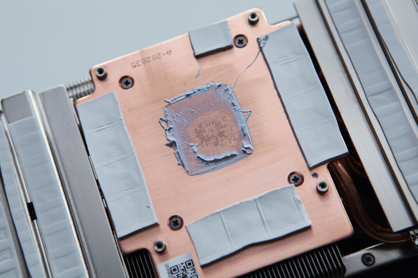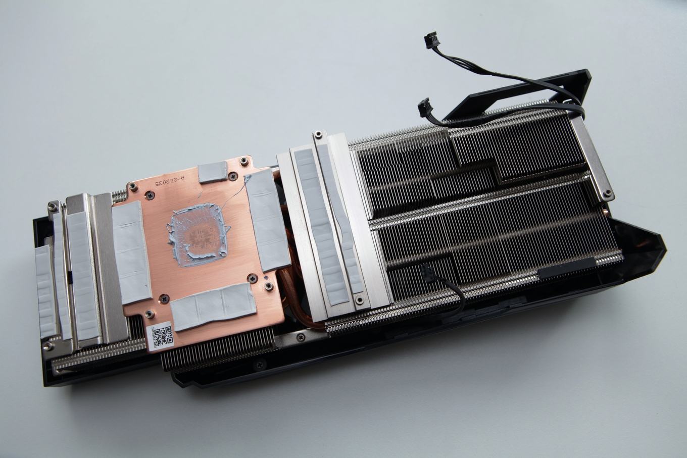 Die GPU und die Speicherchips liegen auf einer gemeinsamen Basisplatte auf. Die VRMs und Power-Stages werden ebenfalls über einen Kühler versorgt. Heatpipes sorgen dafür, dass die Abwärme von der Basisplatte in die gesamten Kühler transportiert werden kann.
