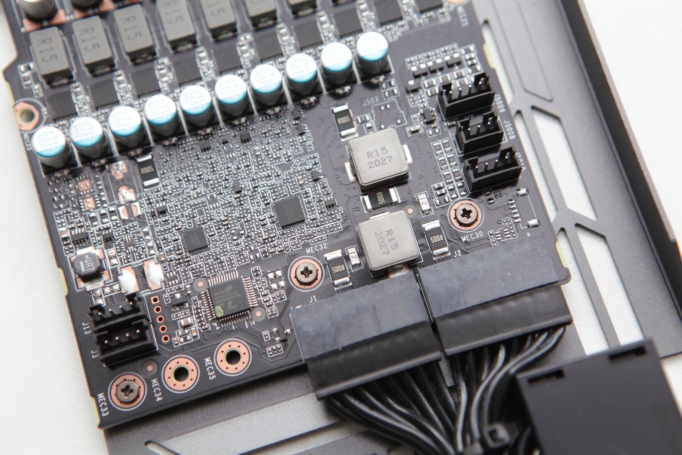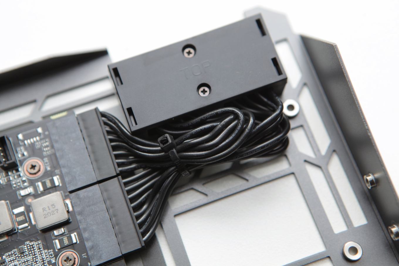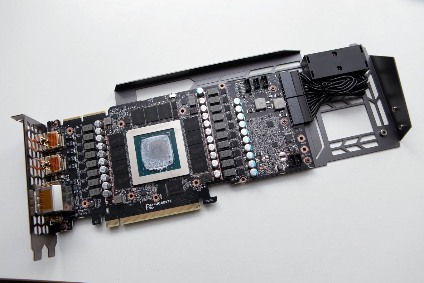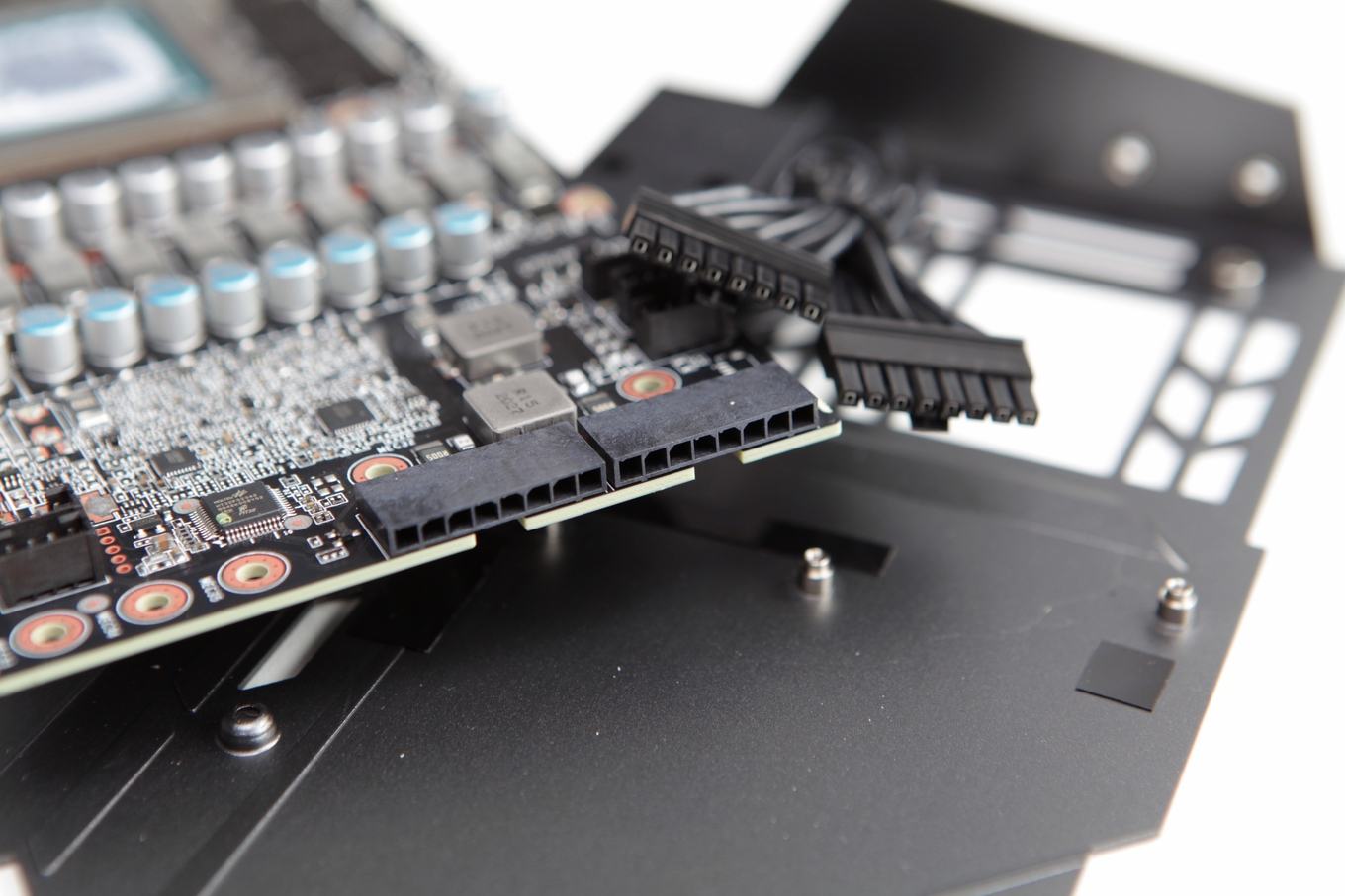 Gigabyte verlängert die 2x 8-Pin einfach 1:1 auf das PCB und nutzt dazu einen besonders flachen Stecker. Wer die Karte auf eine Wasserkühlung umbaut und die Stromanschlüsse verwenden möchte, schaut in die Röhre, da diese keinem Standard entsprechen.