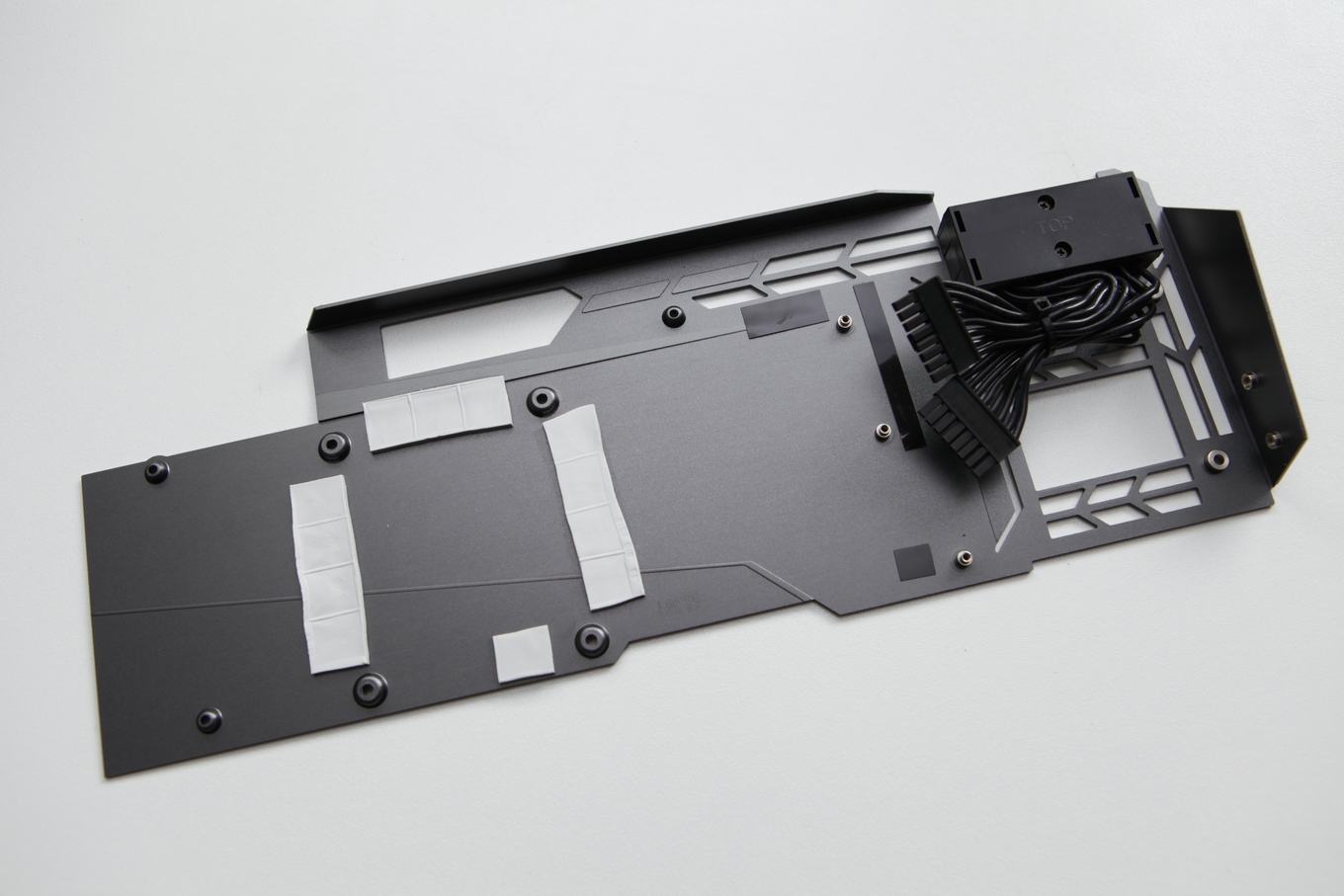 Die Backplate kann die Kühlung unterstützen, im Falle einer Speicherbestückung auf der Rückseite wird dies umso wichtiger. Gigabyte verwendet relativ dicke Wärmeleitpads zwischen der Backplate und den Speicherchips. Wir konnten keine Temperaturprobleme feststellen, machen dazu aber noch genauere Messungen.