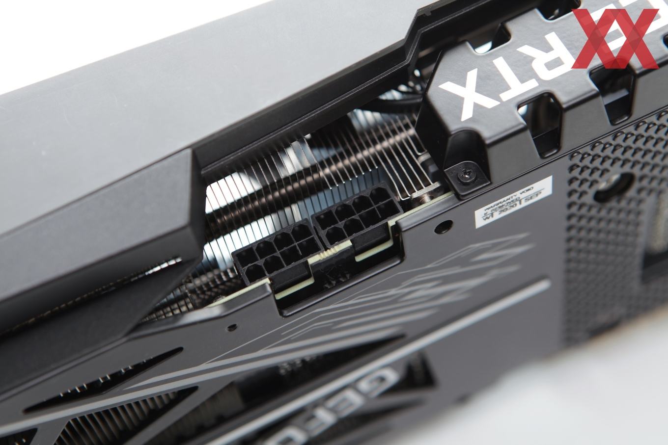 Die zusätzliche Stromversorgung erfolgt über zwei 8-Pin-Anschlüsse. Bei einem Power-Limit von 340 W ist dies mehr als ausreichend, denn neben den nominell 2x 150 W können auch noch 66 W über den PCI-Express-Steckplatz an die Karte geführt werden. Die beiden 8-Pin-Anschlüsse können aber auch deutlich mehr als die 150 W der ATX-Spezifikation übertragen.