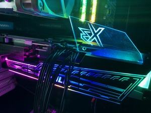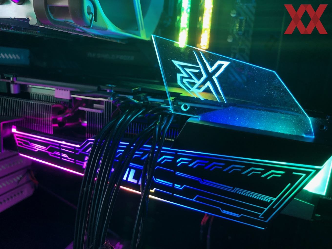 Beleuchtet wird im Übrigen die Stirnseite der Grafikkarte. Hier sind ein schickes Muster und das iChill-Logo angebracht. Im Lieferumfang der Karten ist außerdem eine zusätzliche Plexiglas-Scheibe enthalten, die sich direkt auf die Grafikkarte stecken lässt. Dann wird unter anderem auch das X3-Kürzel mit beleuchtet. Das System ist also sehr umfangreich und flexibel.