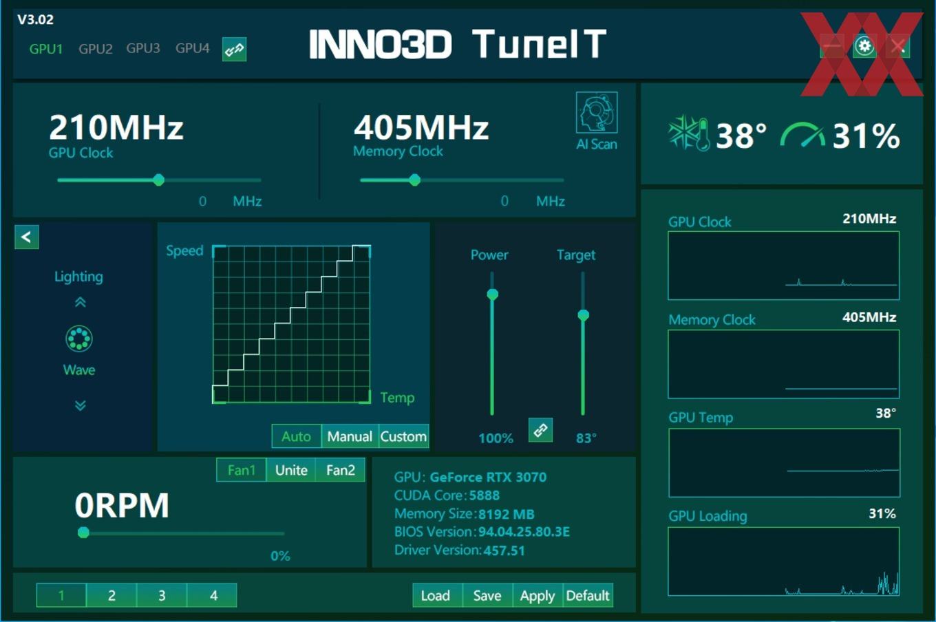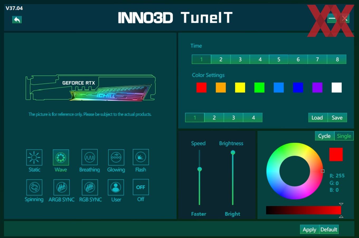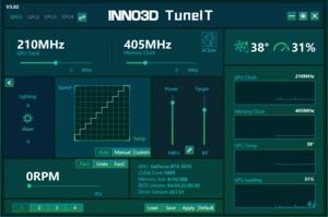Wie bei vielen modernen High-End-Grafikkarten gibt es auch bei den ICHILL-Karten von INNO3D ein schickes Beleuchtungssystem. Dieses lässt sich nicht nur individuell mithilfe von vielen vorgefertigten Leuchteffekten und verschiedenen Farbvariationen konfigurieren und in Sachen Helligkeit und Geschwindigkeit anpassen, sondern auch mit den Systemen vieler Mainboard-Hersteller synchronisieren. Natürlich ist auch eine komplette Abschaltung möglich. Die Ableger mit dem Kürzel "Red" werden zwar ebenfalls illuminiert, jedoch nur einfarbig in Rot, was für den kleineren Ableger unseres Doppeltests gilt.