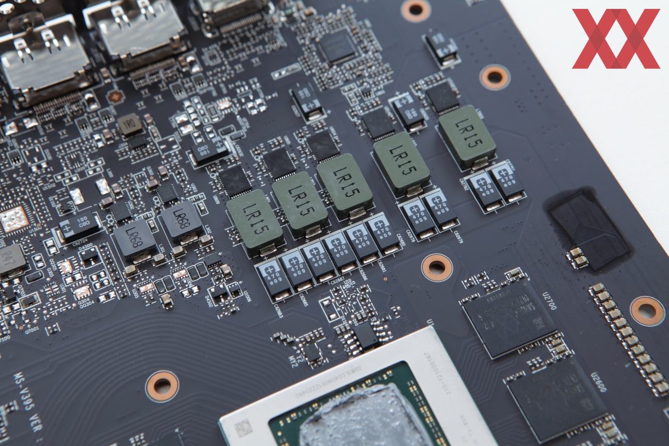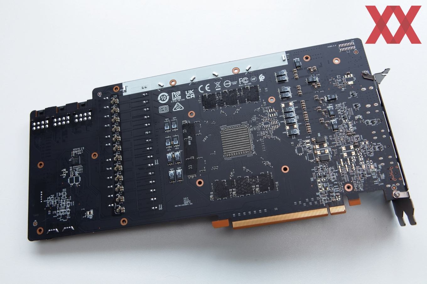Die Rückseite des PCBs, die durch die Backplate komplett verborgen ist, zeigt gut die unterschiedlichen Bereiche. So sind die Rückseite der GPU, des Speicherbereichs und der Spannungsversorgung gut zu erkennen. Der weiße Streifen am oberen Rand dient der Illuminierung des Leuchtstreifens auf der Rückseite.